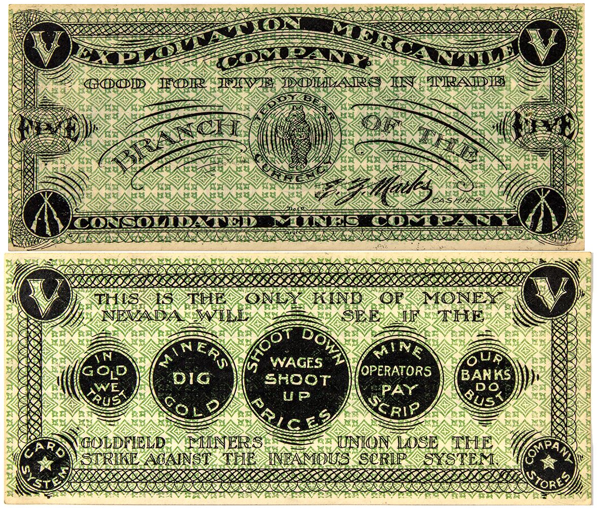 This fabulous piece of scrip (possibly the best known) represents one of the most important (if not the most important) strike by the members of the International Workers of the World. It was printed in Chicago (IWW headquarters) and includes several historical references to the strike. The center picture of the Teddy Bear is reference to President Theodore Roosevelt who sent in troops to quell the strike. The Stacked rifles in the corners represents those troops. The general message of the script is in reference to the attempt by the mine owners to pay the miner sin script and not American money. "This is the only kin d of Money Nevada will see." "In gold we trust, miners dig gold, shoot down prices, wages shoot up, mine operators pay scrip, our banks do bust." "Goldfield Miners Union lose the strike against the infamous scrip system." "Exploitation Mercantile Company." These all refer to that 1907 strike that ended up breaking the union, making George Wingfield the most powerful man in Nevada, and destroying the career of Governor 'Honest John' Sparks.