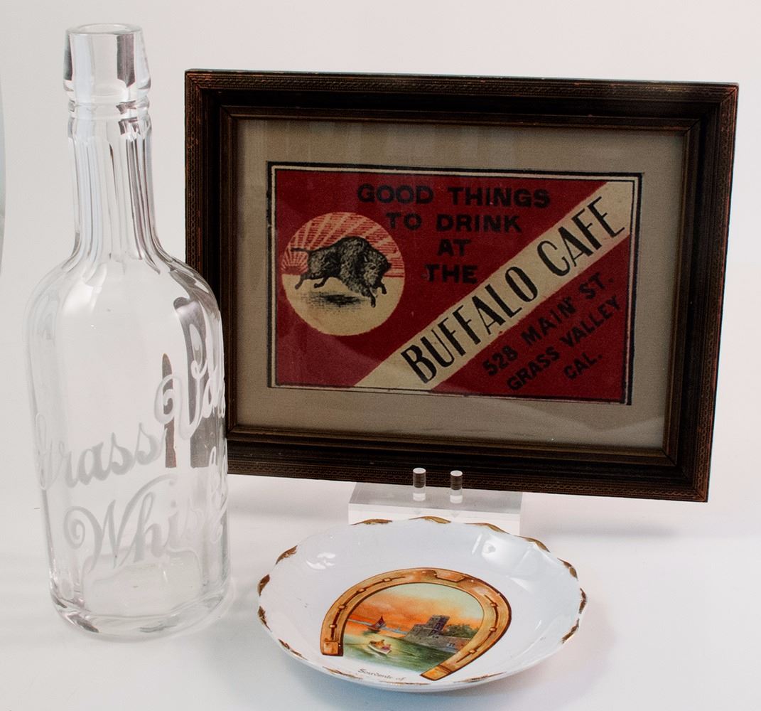 Lot of three. Choice bottle. Back Bar Bottle is c1895-1910. Great Display piece! Also A Grass Valley Souvenir Plate and a Buffalo Cafe Reprint. State: California City: Grass Valley Date: FHWAC#: 42830