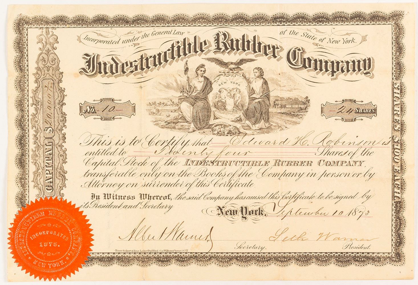 Number 10 for 24 shares to Edward H Robinson in 1873. We could find no reference to this company on the Internet. Signed by secretary Albert Warner and president Seth Warner. Date: Location: New York HWAC # 54558
