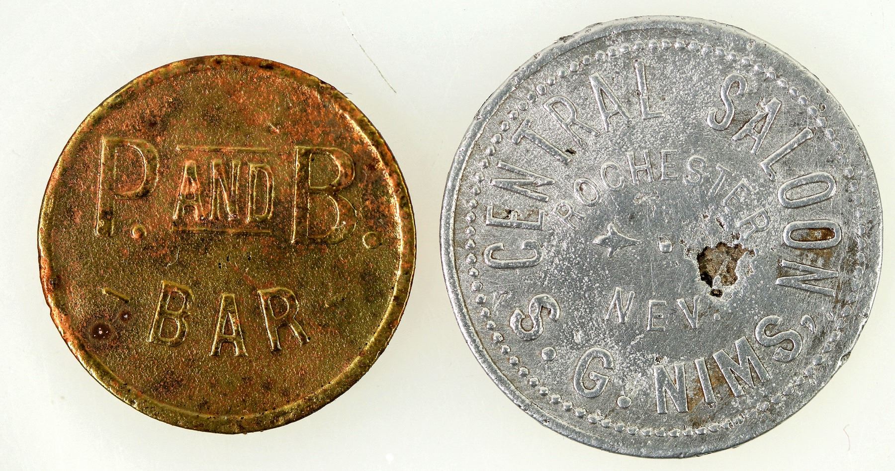 Tokens for 12.5c in trade at two Rochester, NV bars. These extra rare tokens are in appealing condition. The golden token varies from golden to coppery in appearance, with green and pink hues. These tokens are marked with small rust imperfections and the chrome token has a 2mm flaked-off blemish. See photo.