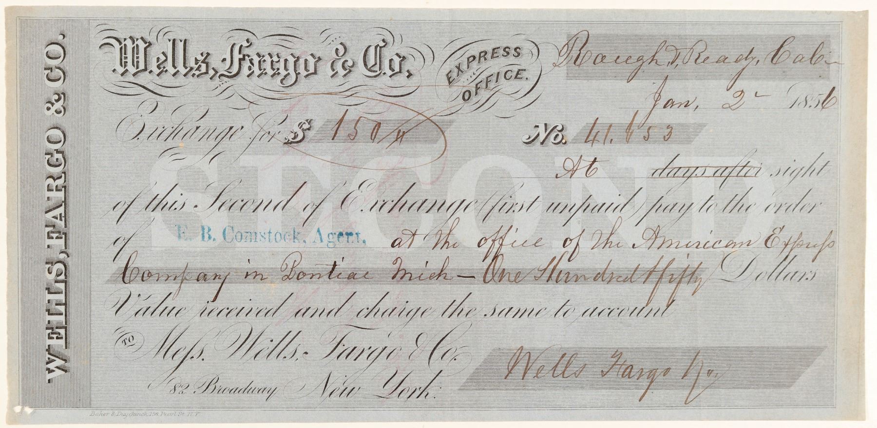 # 41,653 for $150 to agent EB Comstock of Pontiac, Michigan. Endorsed on back to John Comstock. Small holes lower left; otherwise extremely nice. Rough and Ready is located west of Grass Valley, California. The first established settlement in Rough and Ready was made in the fall of 1849 by a mining company from Wisconsin, known as the Rough and Ready Company, during the California Gold Rush.[4] Their leader, Captain A. A. Townsend, named the company after General Zachary Taylor (nicknamed "Old Rough and Ready") who had recently been elected the 12th President of the United States. Captain Townsend had served under Taylor when he commanded the American Forces during the Blackhawk War.