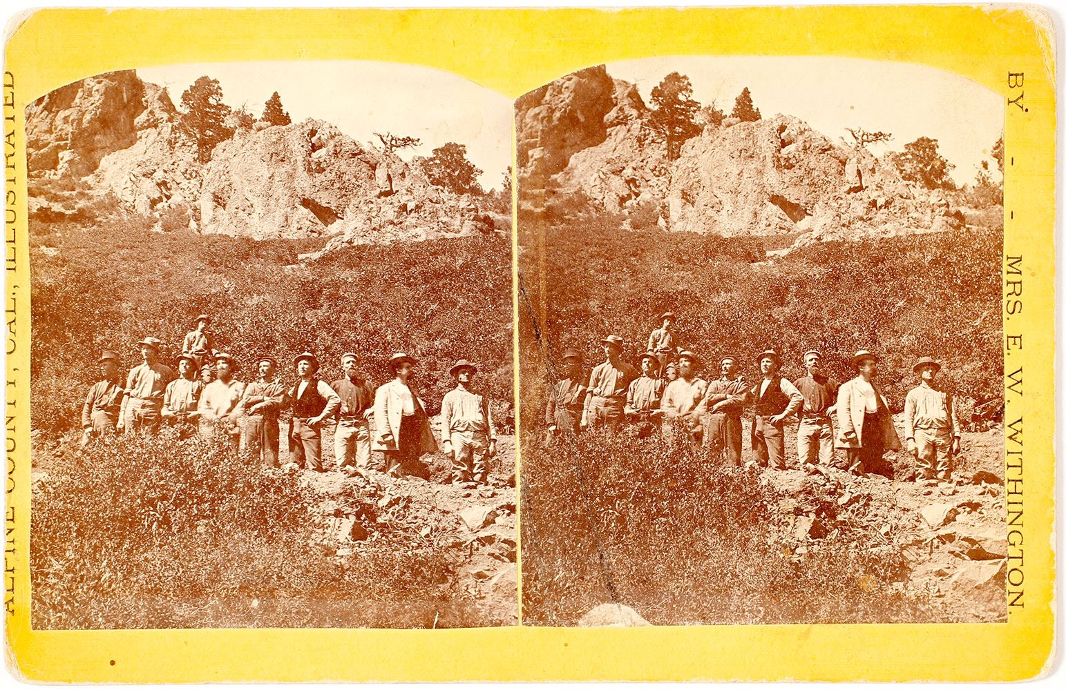 "Miners of the Exchequer 1876" from Alpine Co., California, (standing in the prospect). Stereo views by Mrs. E.W. Withington, Photo Artist, Ione City Cal. No notable condition issues, only very slight wearing on each corner of stereo view. 7" x 4.5". Date: 1876 Location: Alpine, California HWAC# 57510