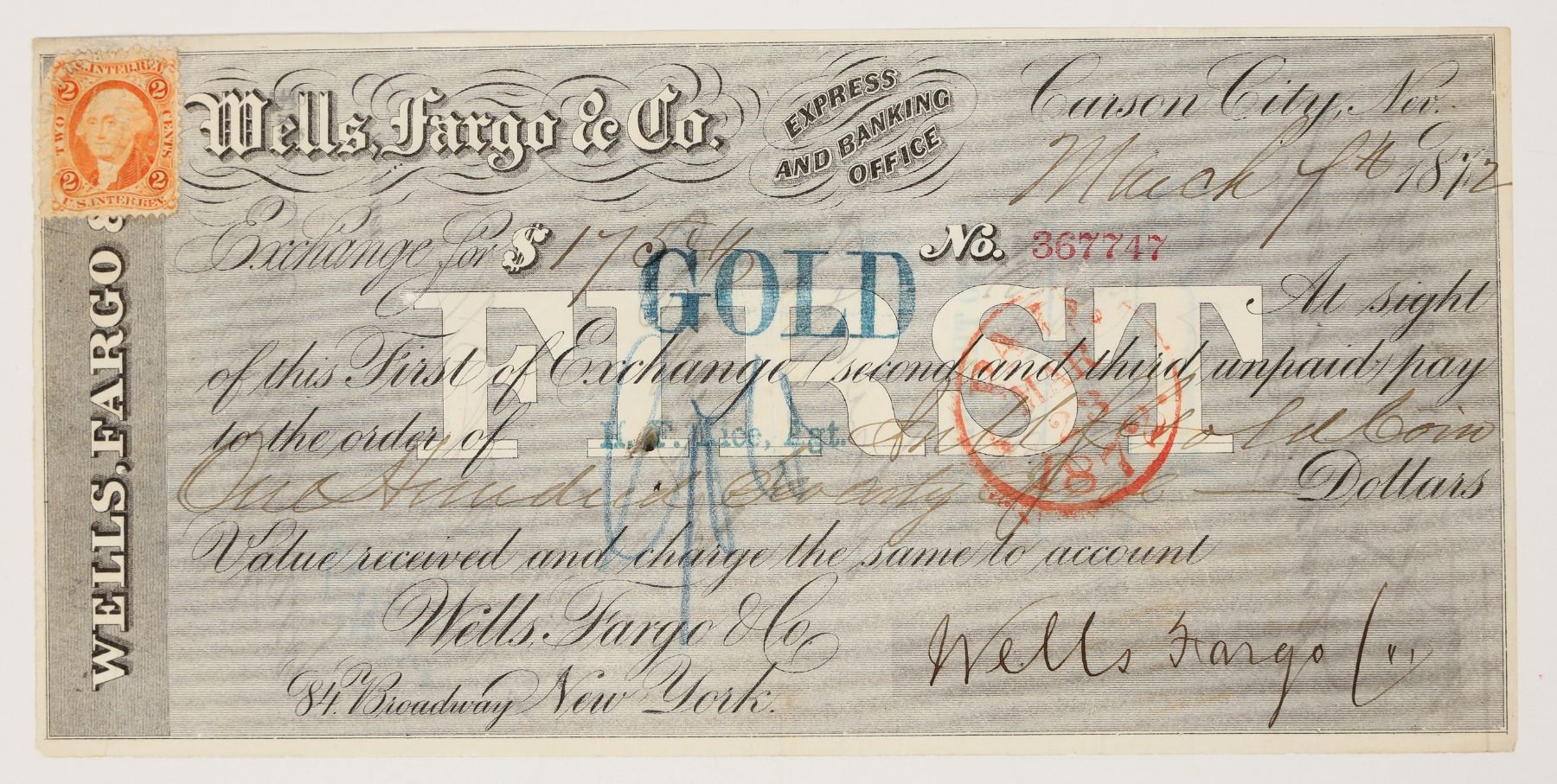 Only a few known. Dateline Carson City, Nev., March 7th, 1872. Issued to Wells Fargo agent (and second supt. of the Carson City Mint) HF Rice for $175 in gold coin (stamped GOLD). Two cent revenue stamp in upper left corner. 4 x 8.5"