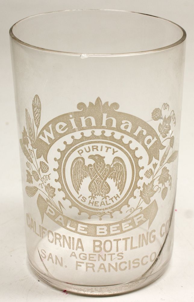Etched with eagle in the middle. "Weinhard / Pale Beer / California Bottling Co. / Agents / San Francisco." See photograph for large crack (but not through etching). Burt Collection