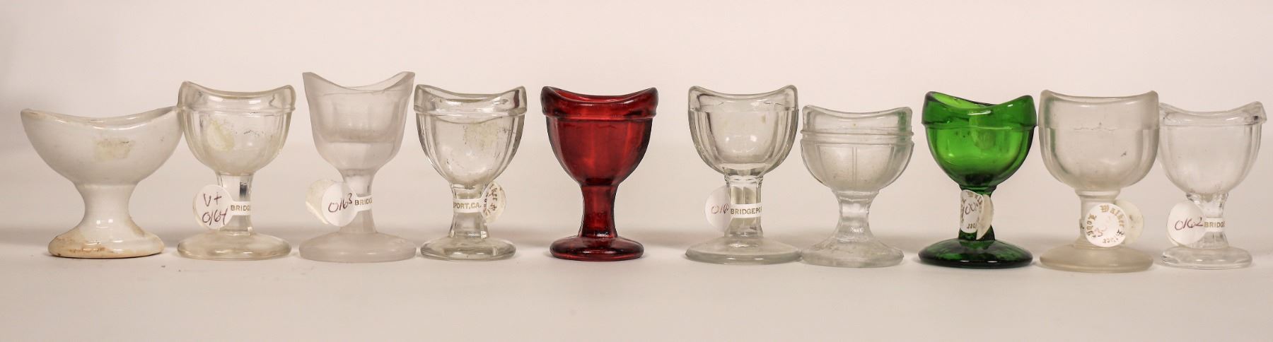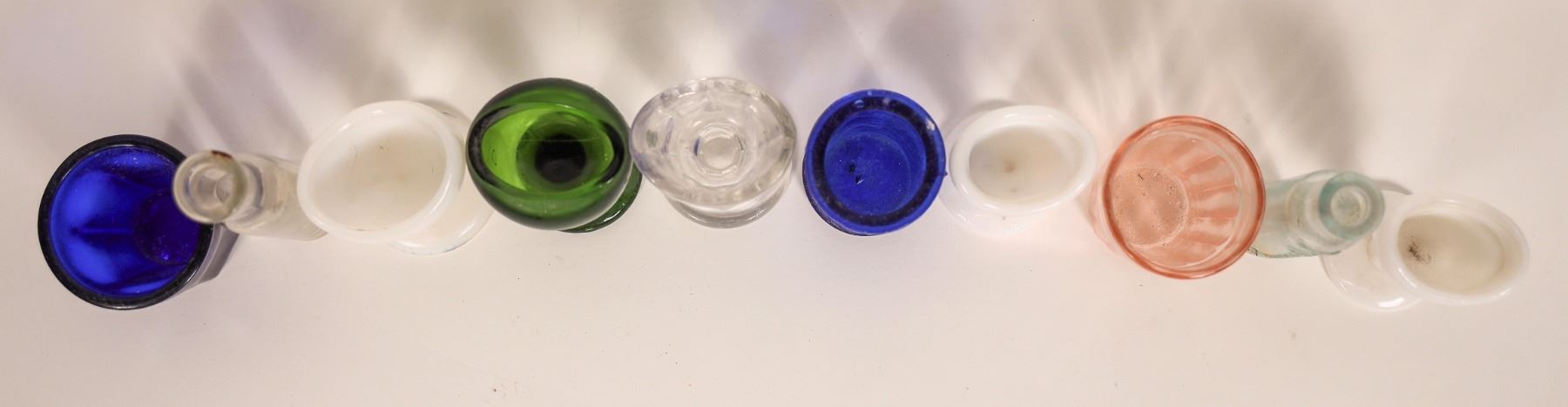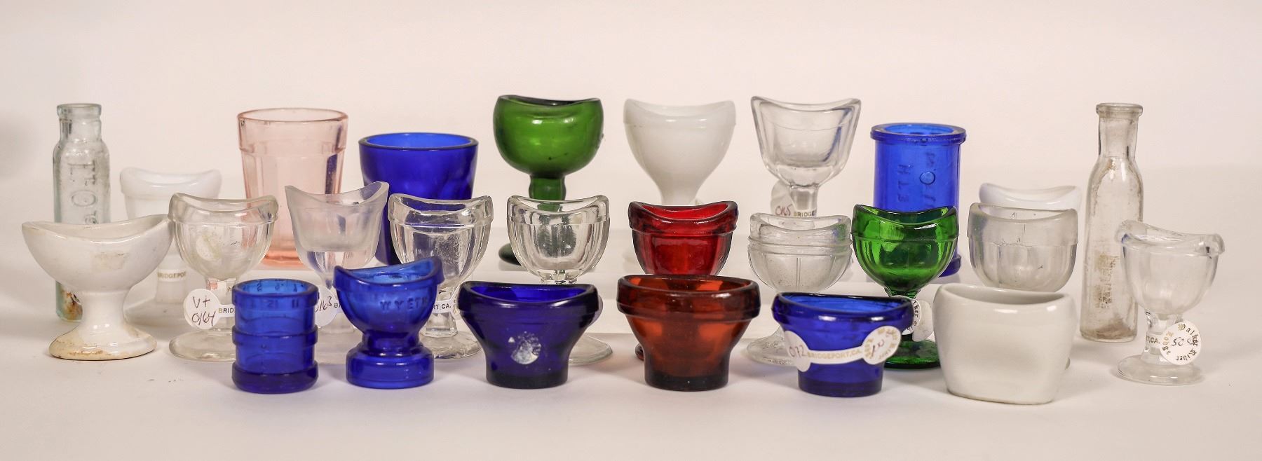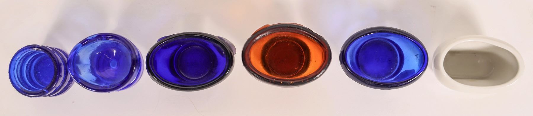 About 30 cobalt, ceramic, green, clear and amber eye wash cups. About 2" tall See photo.