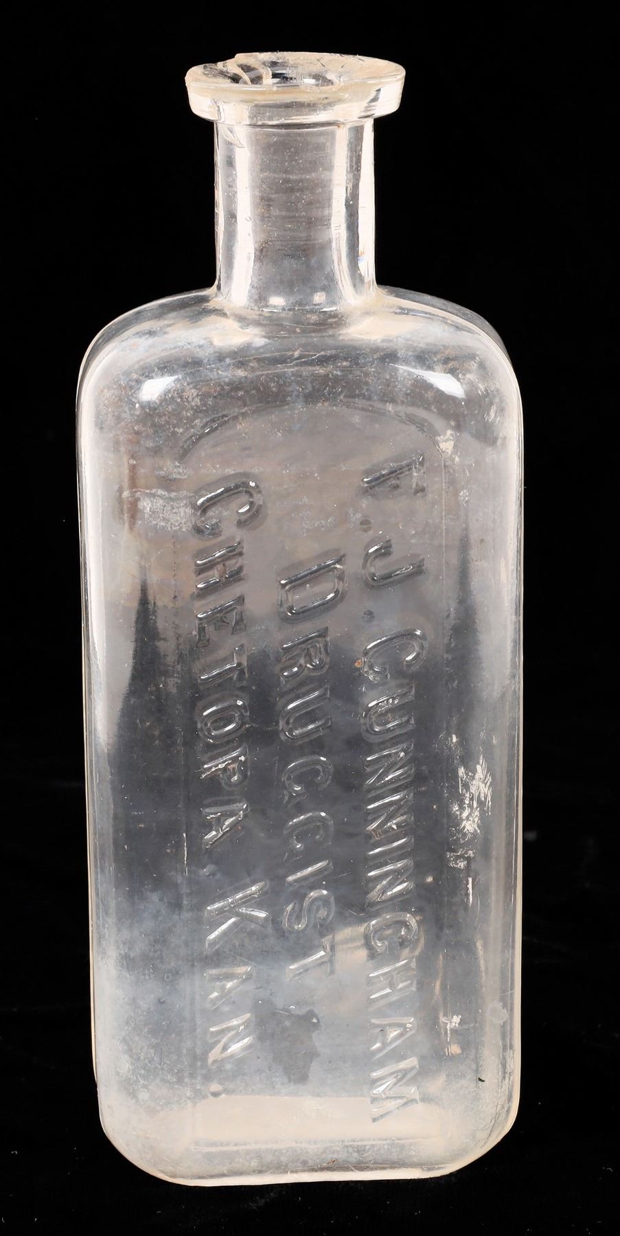 Embossed F J Cunningham medicine bottle. 6", 2 lip chips. Please inspect. Kansas Chetopa Gary Bracken Collection [Chetopa] [Kansas] [Gary Bracken Collection]