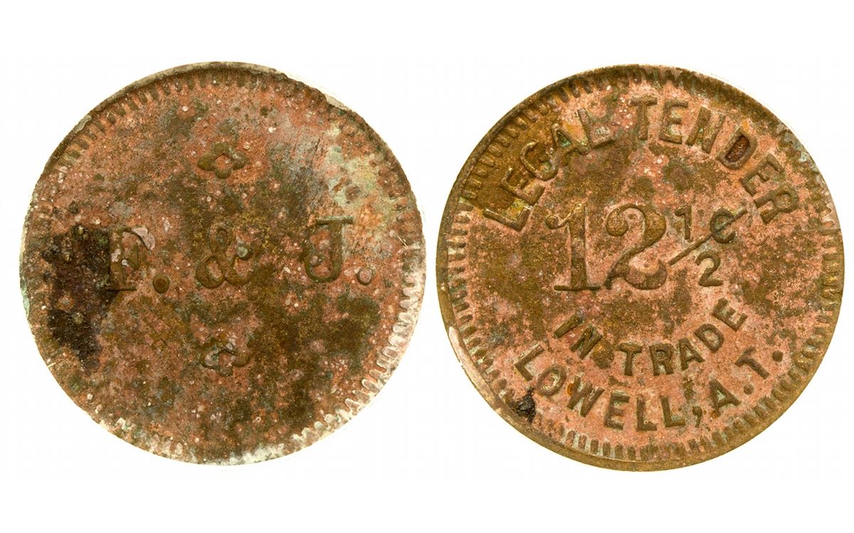 Obv.: Legal Tender / 12 1/2c / In Trade / Lowell, A.T.; Rev.: F & J (environmental damage); NCS genuine, R6.
