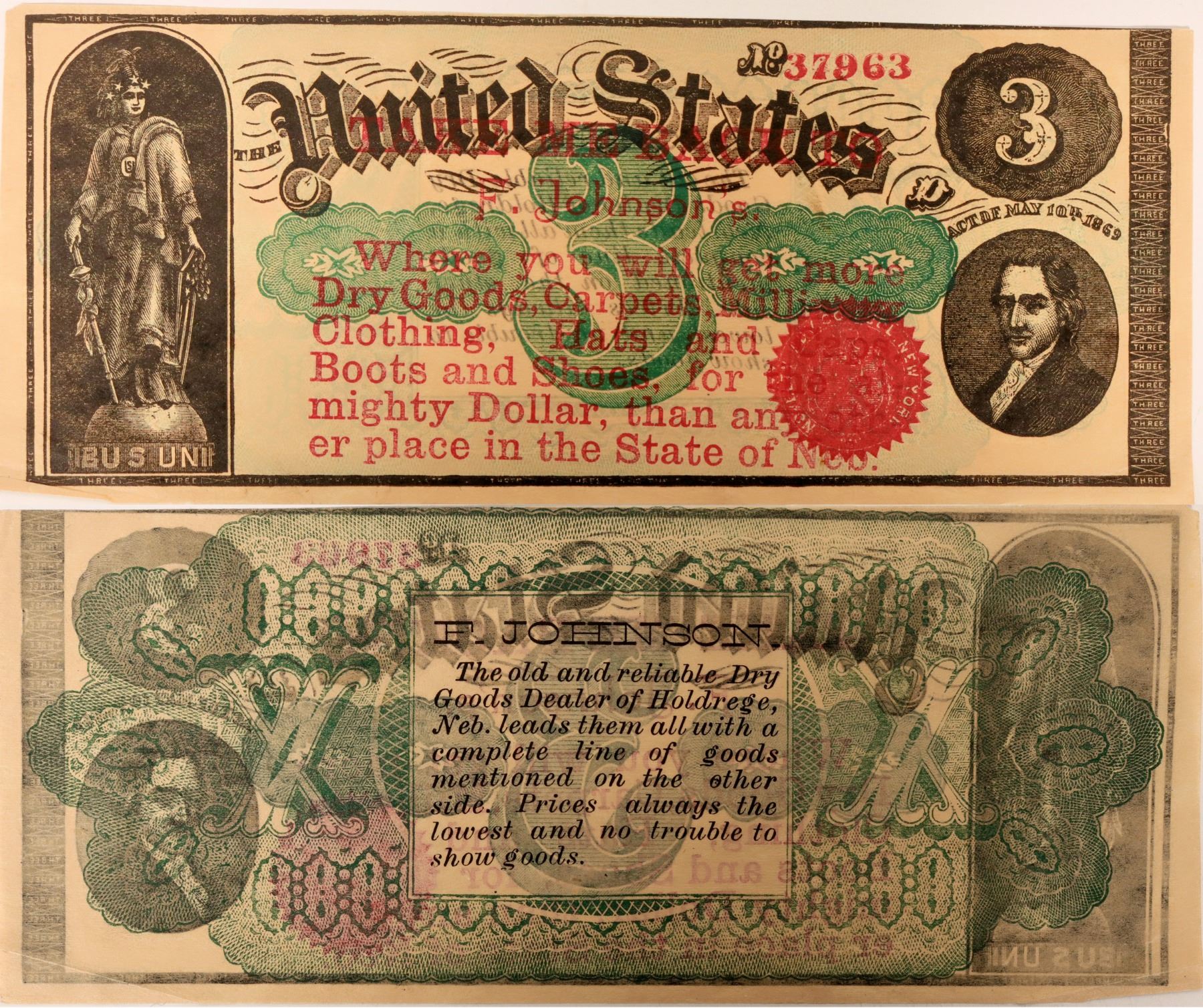 Currency size bill serial number 37963 for "3" Obv.: The United States / F. Johnson's / Where you will get more/ Dry Gods, Carpets, Millinary/ Clothing, Hats and Caps / Boots and Shoes, fo the all / mighy Dollar, then any oth / er place in the State of Neb.; Rev.: F. Johnson / The old and reliable Dry / Goods Dealer of Holdrege, / Neb. leads them all with a / complete line of goods / mentioned on the other /side. Prices always the / lowest and no trouble to / show goods. Date: 1869 Country (if not USA): State: Nebraska City: Holdrege Provenance: Fred Holabird Collection