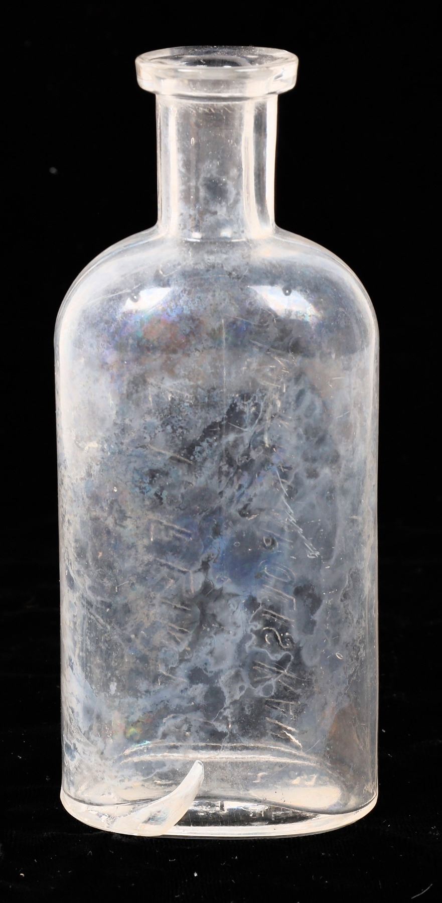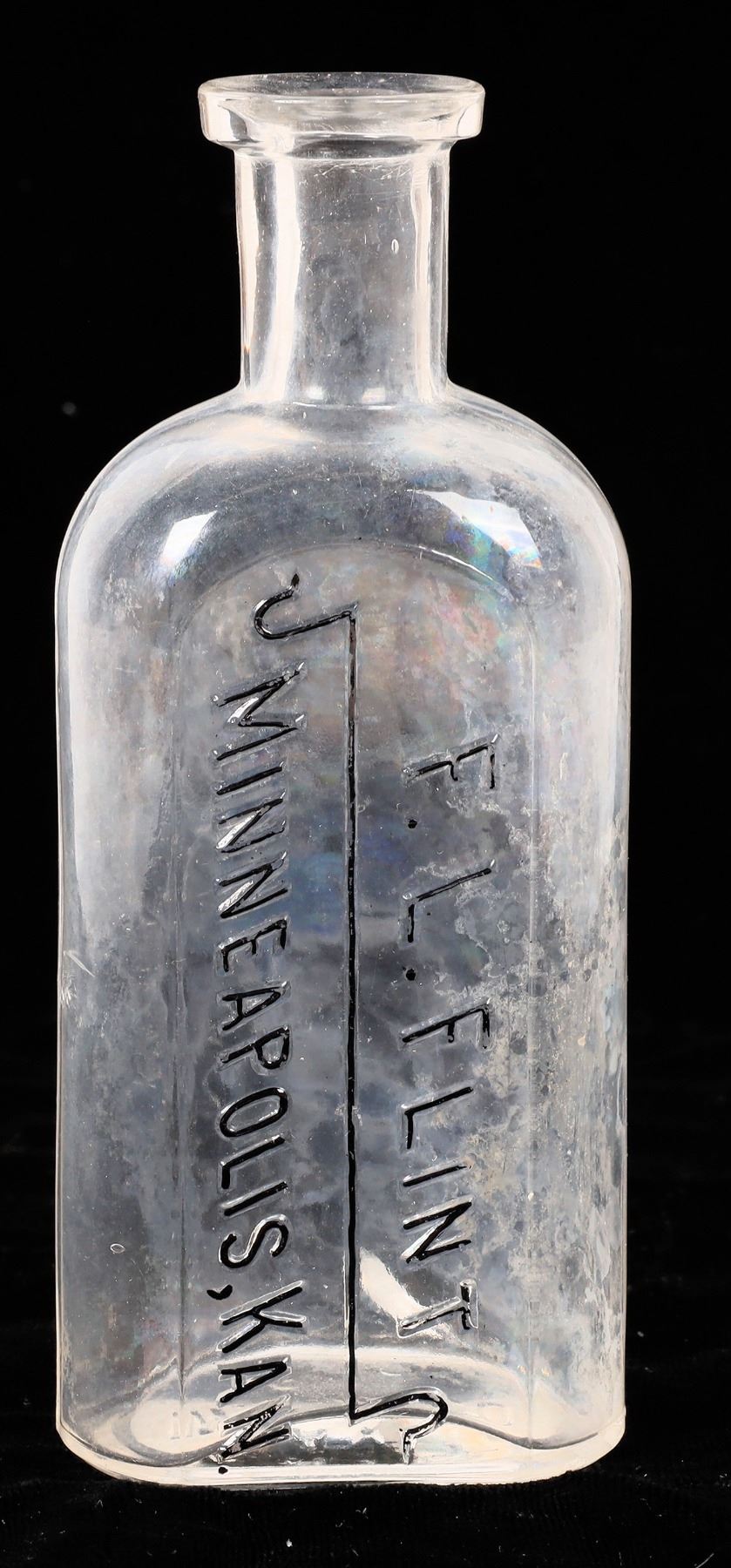 Black embossed F L Flint/Minneapolis, Kan. medicine bottle. 5.25". No apparent chips or cracks.