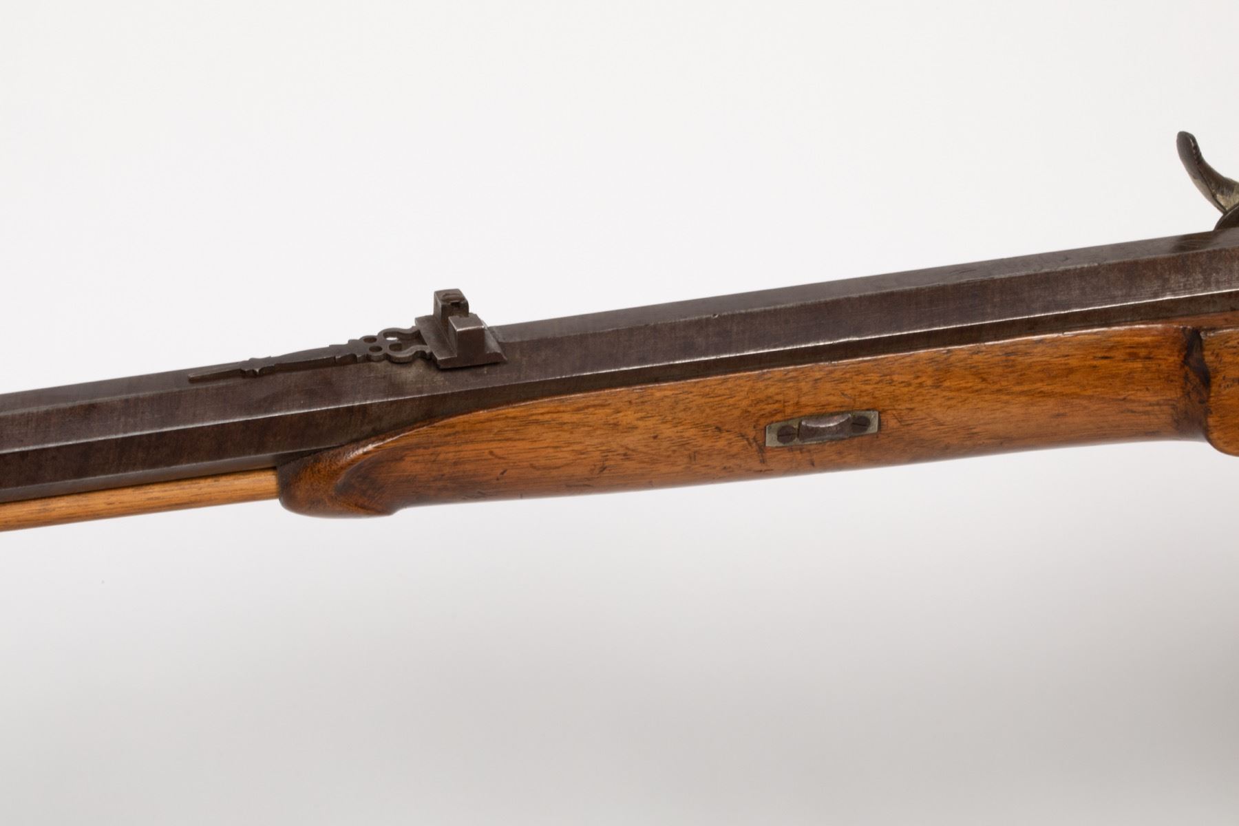 Back Hammer Target/Hunting Rifle, F. Schlegil (German?), . 50 cal, ramrod, octagon barrel, fixed sights, smooth fore/ checkered pistol grip, patch storage, name in gold, "in Tamsweg" engraved on side plate. Fancy engraving. Fancy carved wood. Repaired hammer. SN: N/A, JMD Oval Tag: 3416, Condition: Excellent, >