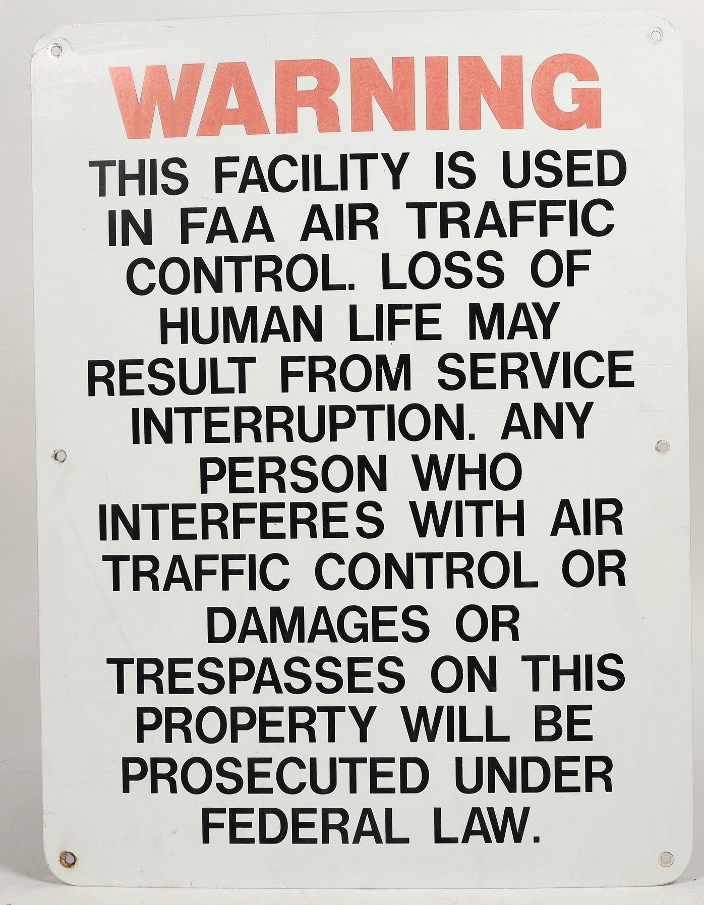 Metal sign, 18 x 24 inches: WARNING (in red) / This facility is used in FAA air traffic control. Loss of human life may result from service interruption. Any person who interferes with air traffic control or damages or trespasses on this property will be prosecuted under federal law. Six holes for mounting.