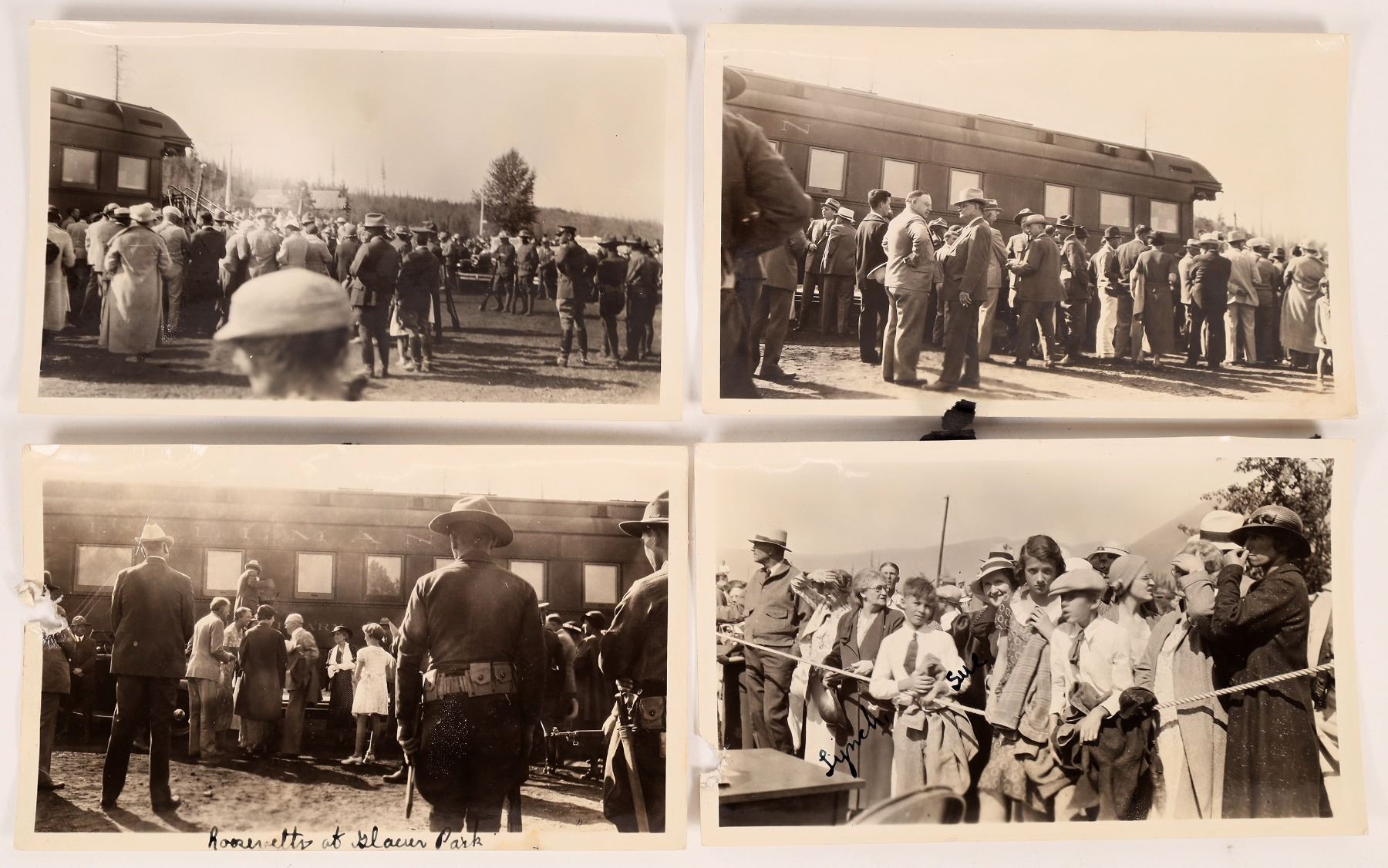 4 original photos of FDR and his train at Glacier Park. Eleanor, military and spectators visible, FDR must not be far away. 3.5x5.75".
