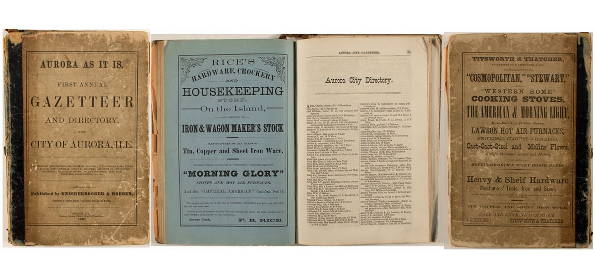 Aurora As it is. First Annual Gazetteer and Directory of the City of Aurora, Ill. Compiled by Knickerbocker & Hodder. Beacon Steam Print. 1868. The binding and the covers are very worn. The back cover is almost completely detached. The pages are fine except for the first few, which are detached from the binding. According to the OCLC, there is only 1 listing for this directory. Rarity: [i].