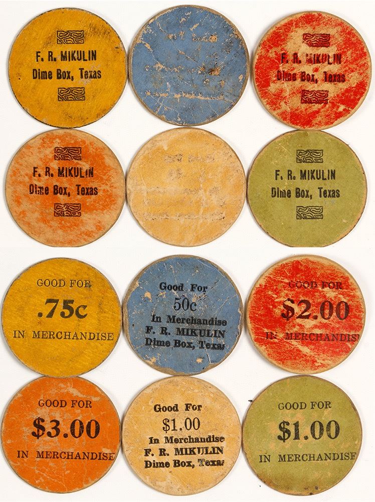 6 different round paper 37 mm. Blue 50c, yellow 75c, green $1 .00, brown $1.00, red $2.00, orange $3.00 HWAC# 62303 Date: Location: Dime Box, Texas