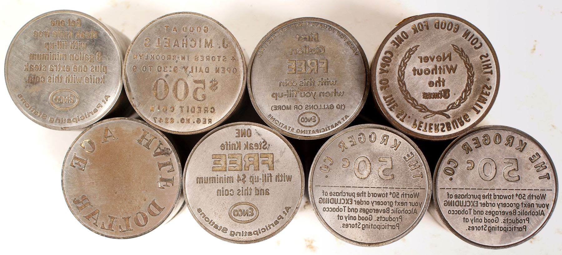 Such a deal we have for you with these eight 37mm token dies: First Gallon Free at Enco; One Steak Knife FREE at Enco (2 of these); Free Copy of the St. Petersburg Times; 50 Cents at the Kroger Co. (2 of these); $500 Good At J. Michaels, 4 stores in Brooklyn; Ace Half Dollar. You'll always find great deals at Holabird's.