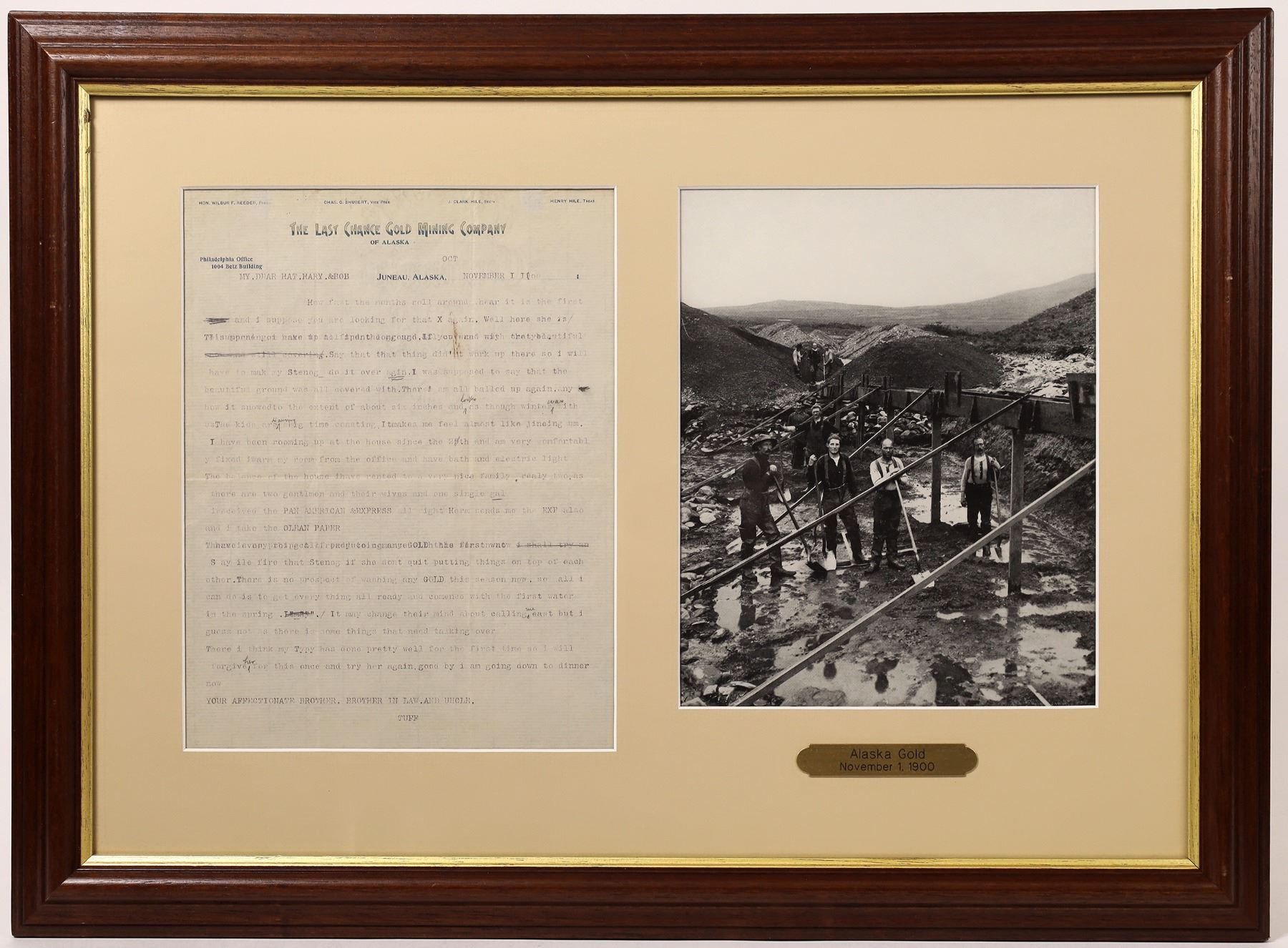 Last Chance Gold Mining Company framed letter and photograph. From Finest Known Exquisite Historic Rarities. Letter dated November 1, 1900. Author is letting his friends know there is 6 new inches of snow and that he had moved to the house with electric lights and a bath. Picture is 11 x 8.5". Shows four miners in foreground ready to dig for gold. A great placer mining scene. Extremely nice frame; 18 x 24. The current Last Chance Museum sits about a mile and a half up the hill from downtown Juneau.