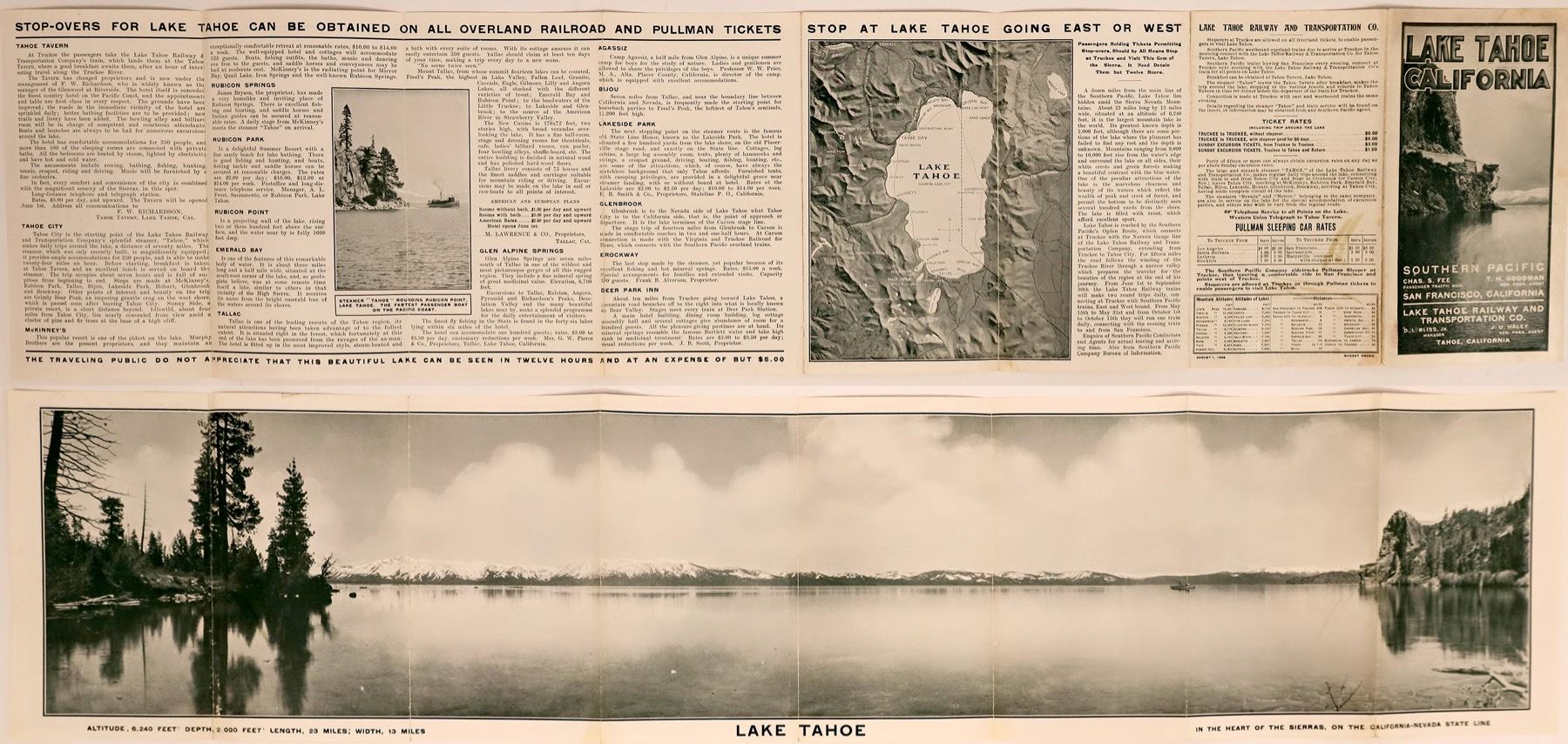 Ultra-rare brochure published jointly by Southern Pacific and the Lake Tahoe Railway & Transportation Company in 1906. Sunset Press. Unfolds to wonderful 8 panel panorama of the lake with steamer near Cave Rock (31.5" x 7.25"). Reverse has descriptions of the resorts and tourists spots around the lake, as well as a map, and railroad rates. Some stains and other wear. 7.25 x 4" This historic brochure dates to right when the Bliss Tahoe tourism industry was in full force, just after the Tahoe Tavern had been finished and DL Bliss was using his new railroad and steamer line to ferry people around the lake.