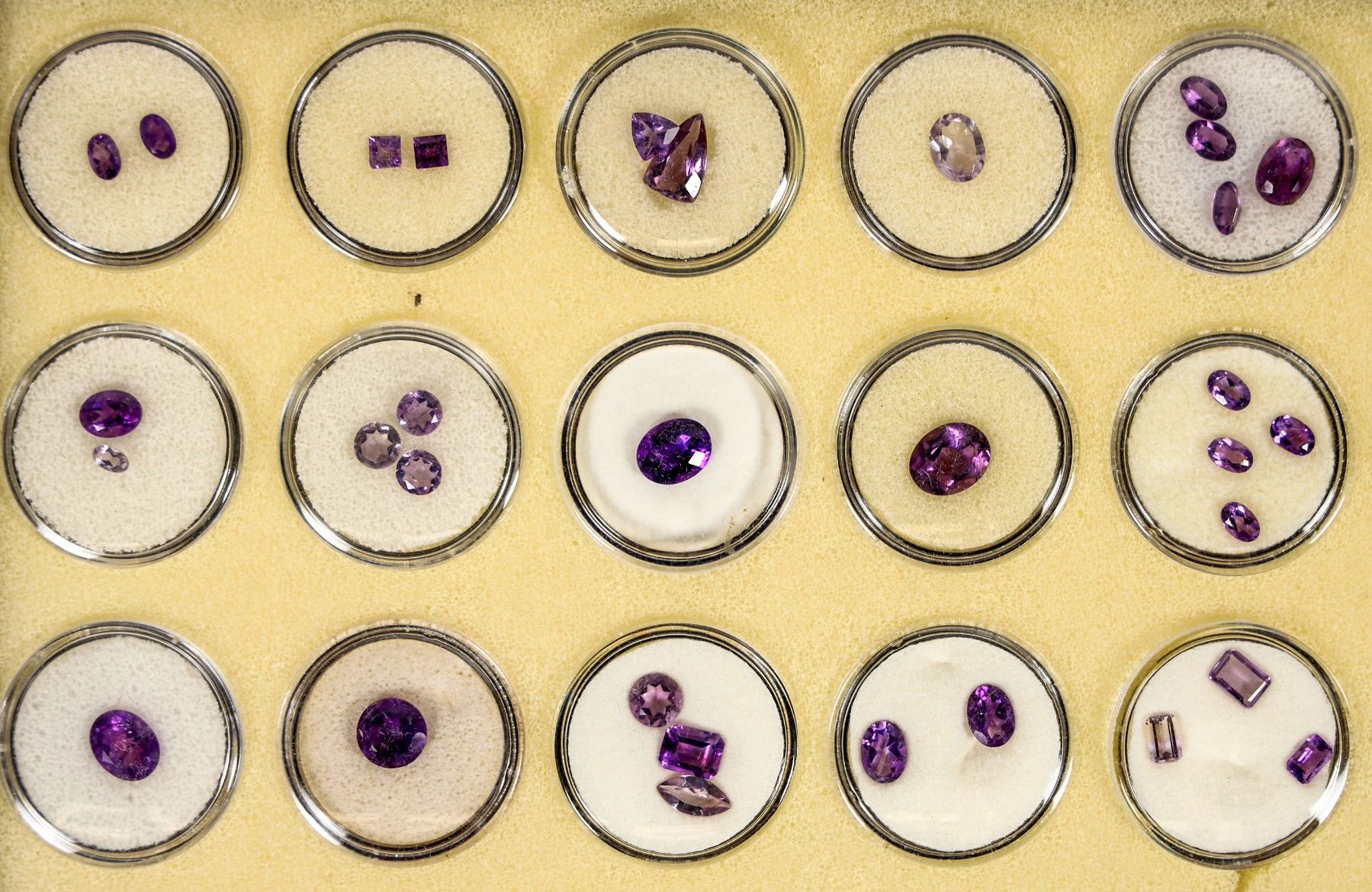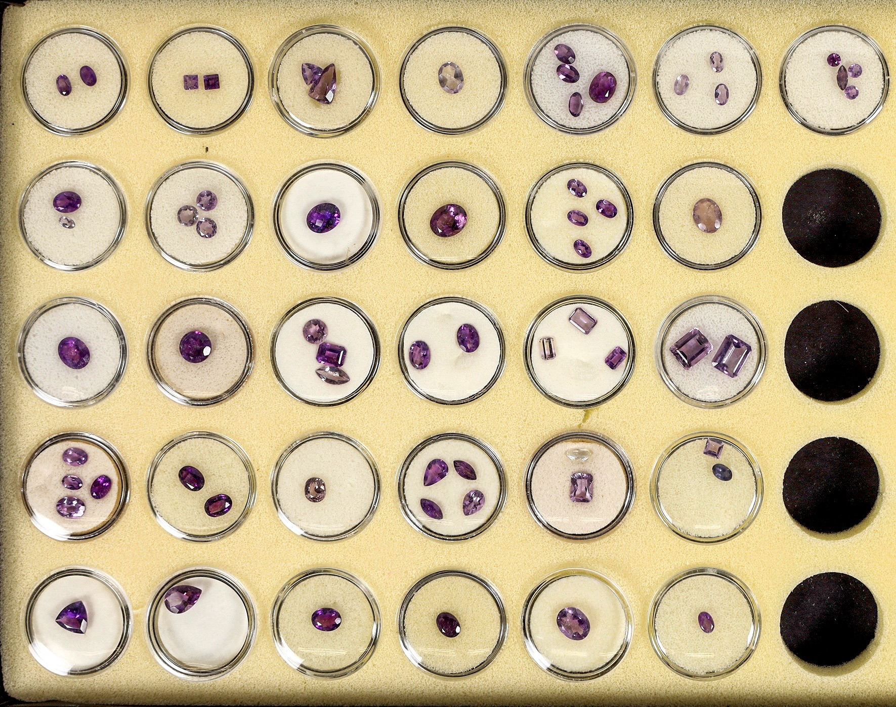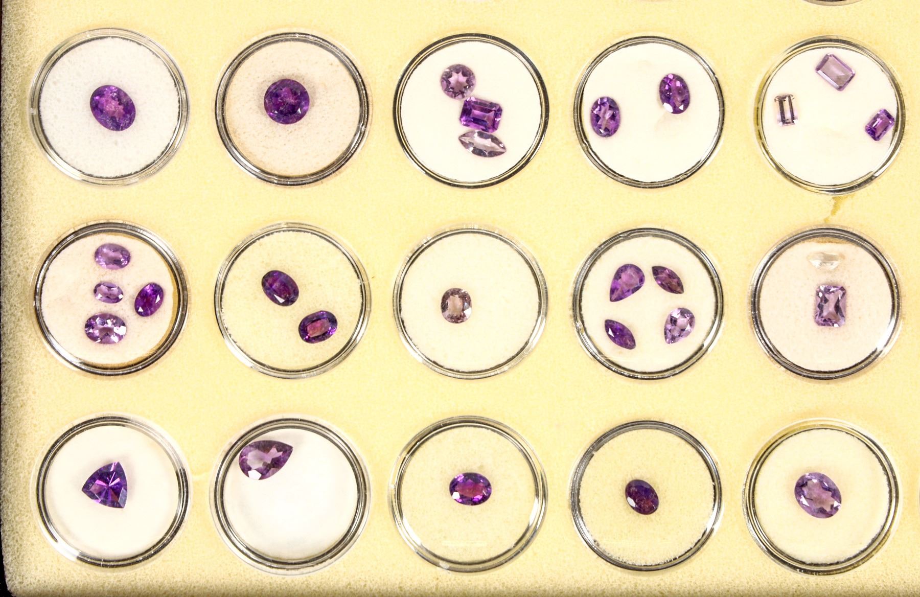 Faceted Amethyst Varieties. 31 1" circular gem holders containing more than 50 gemstones. Generally 4mm up to 1cm. Numerous different faceted shapes and purple hues.