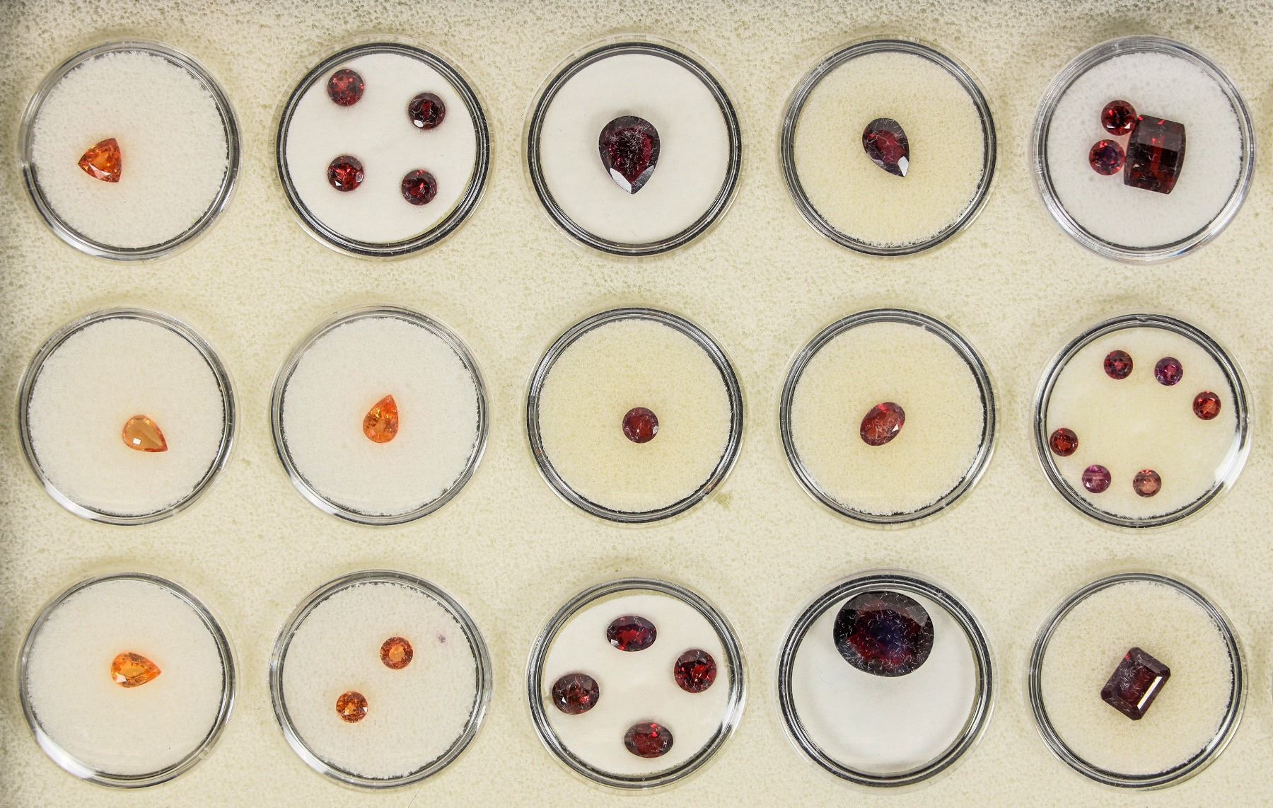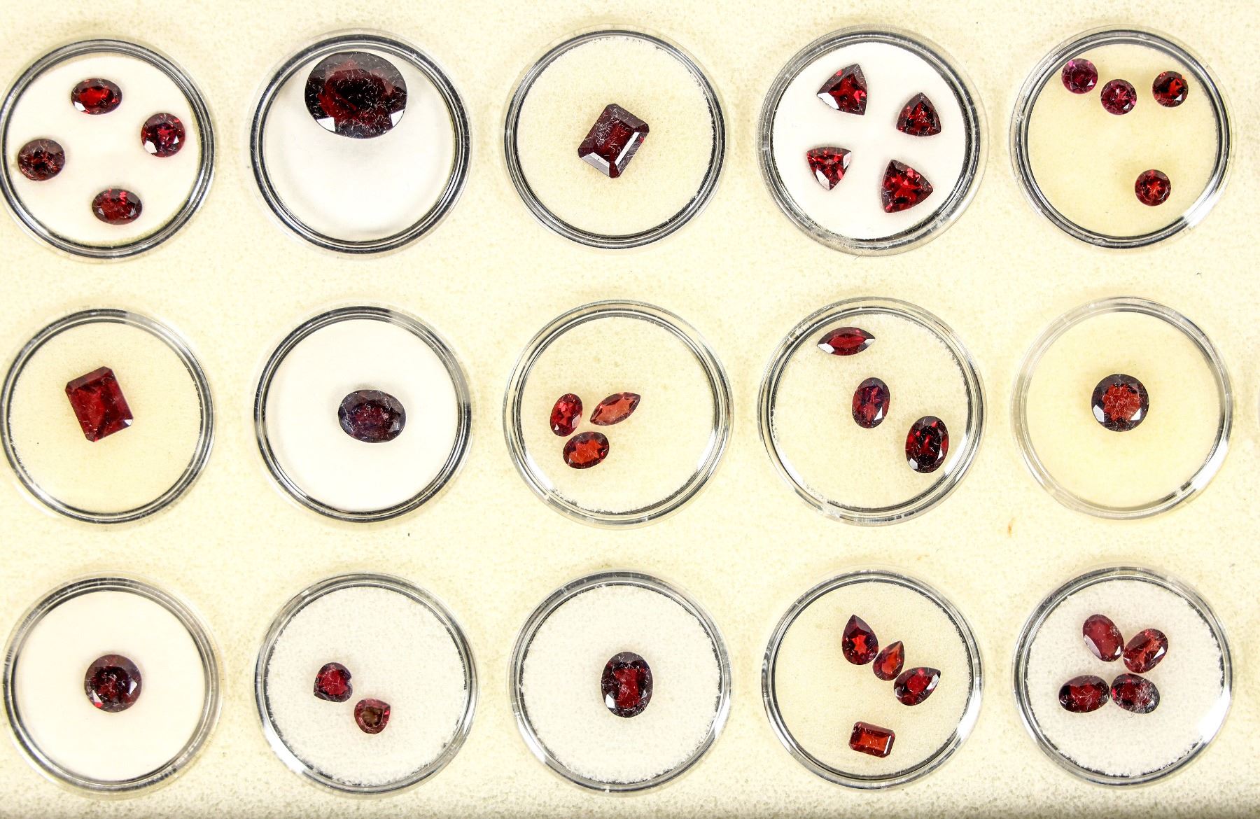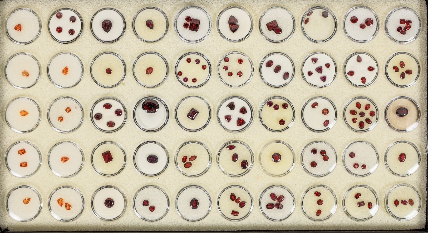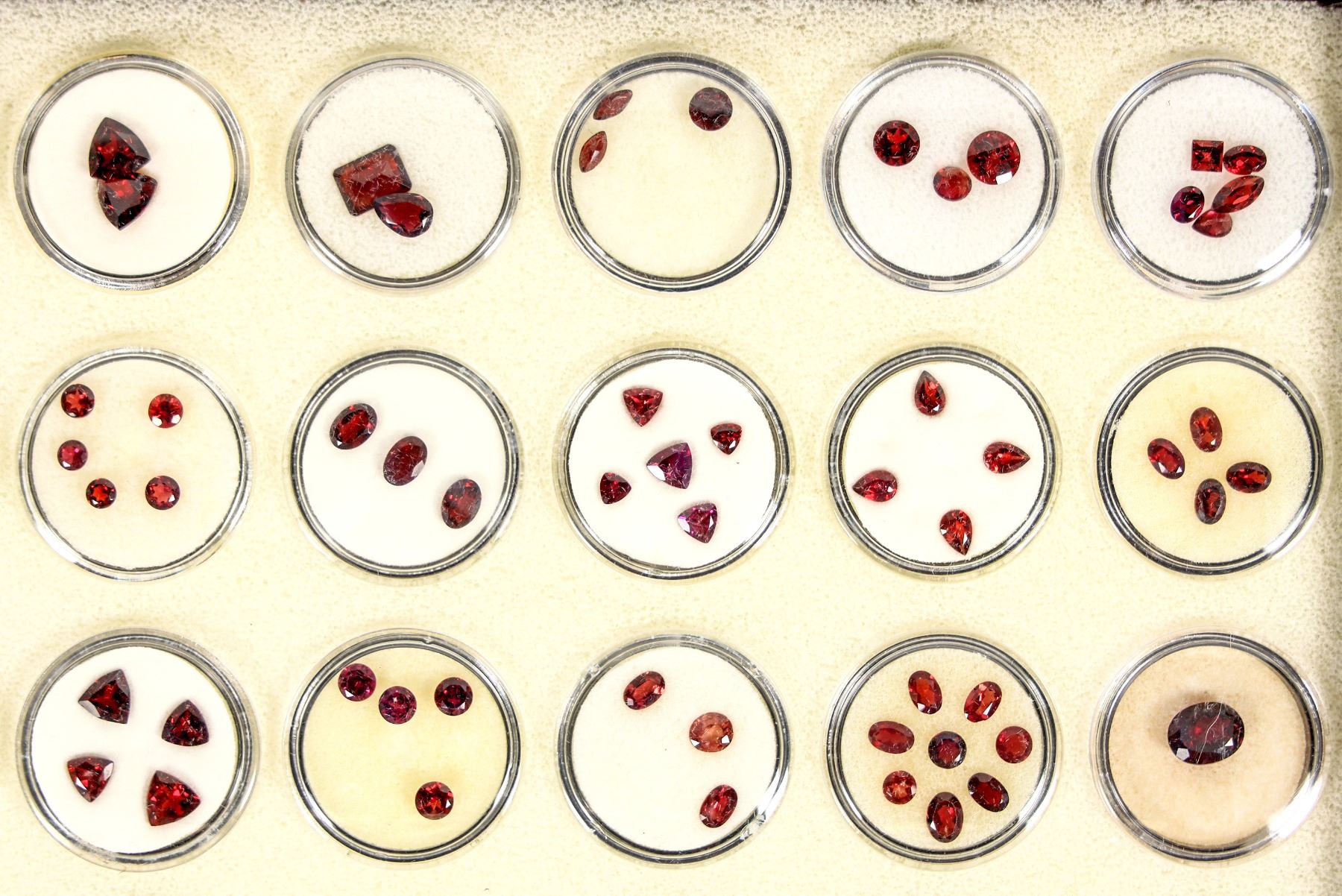 Faceted Garnet Varieties. 50 1" circular gem holders containing more than 100 faceted gemstones of varying sizes and garnet varieties. Includes spess garnet, red garnet and other varieties. Generally 5mm up to 1.5cm. Numerous different faceted shapes and hues.