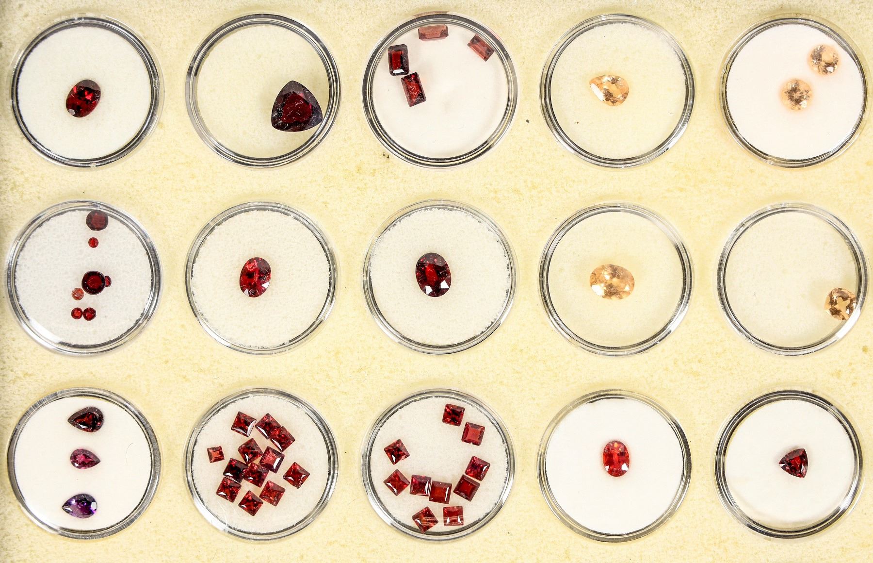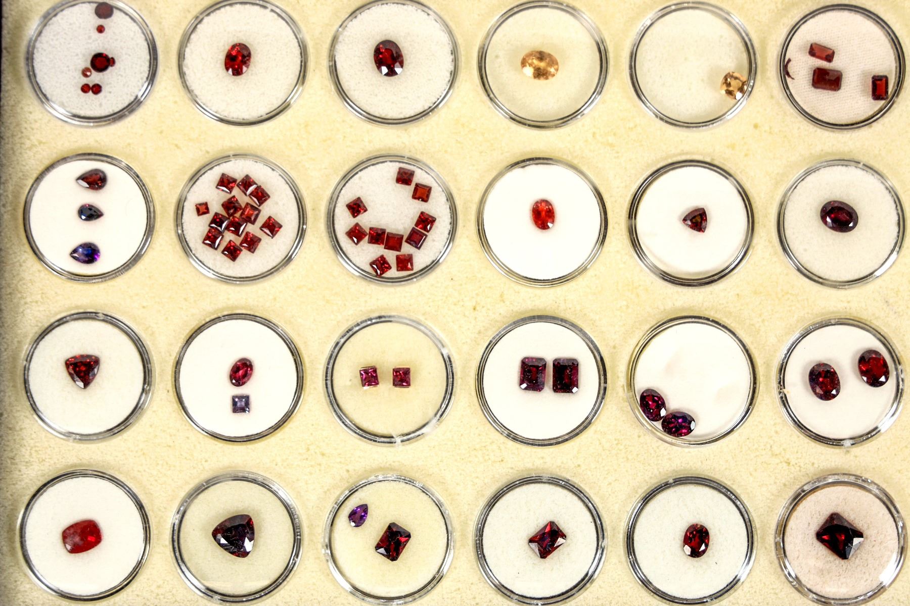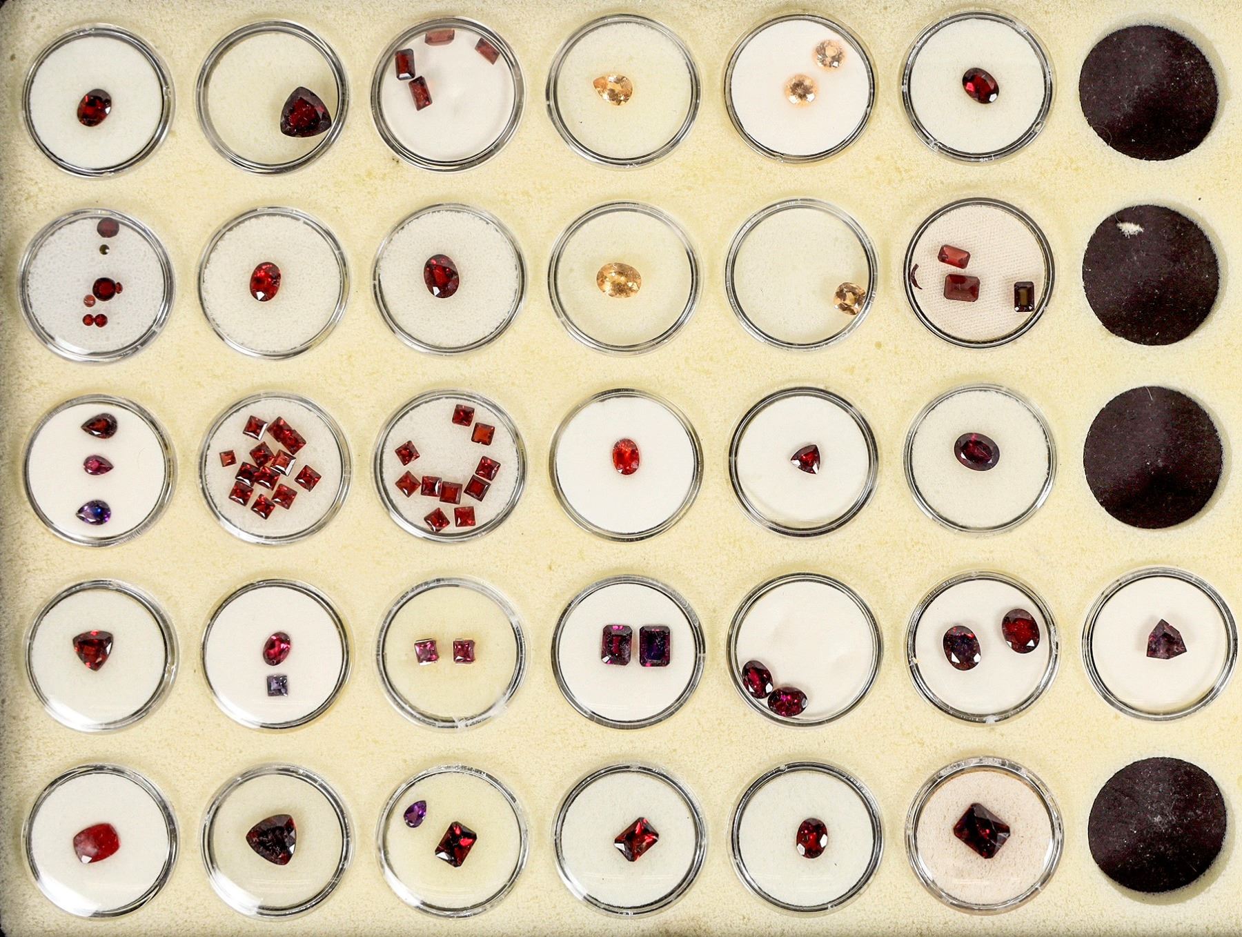 Fine Collection of 10 different faceted garnet gemstones in 1" circular gem holders. Only 30 containers overall. 50 or more stones overall. Generally 3mm up to 8mm. Numerous different faceted shapes and hues.