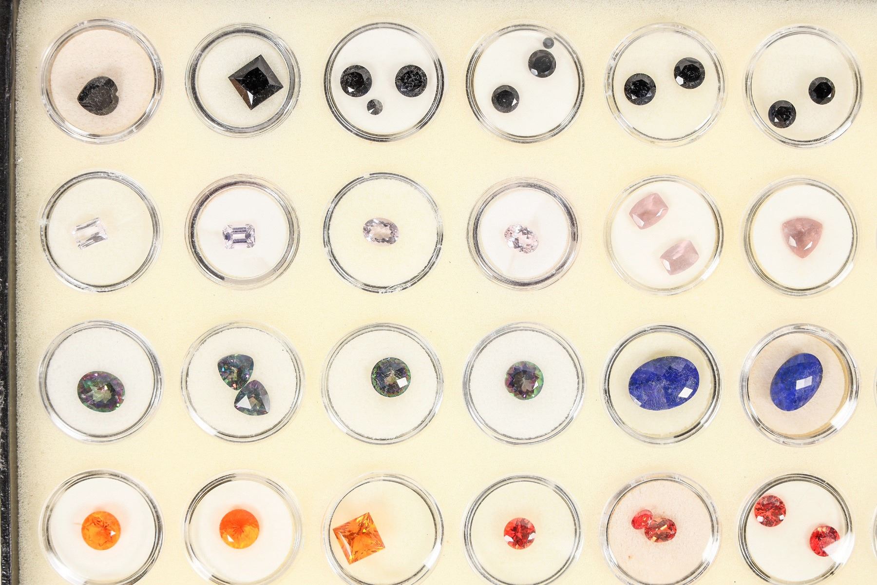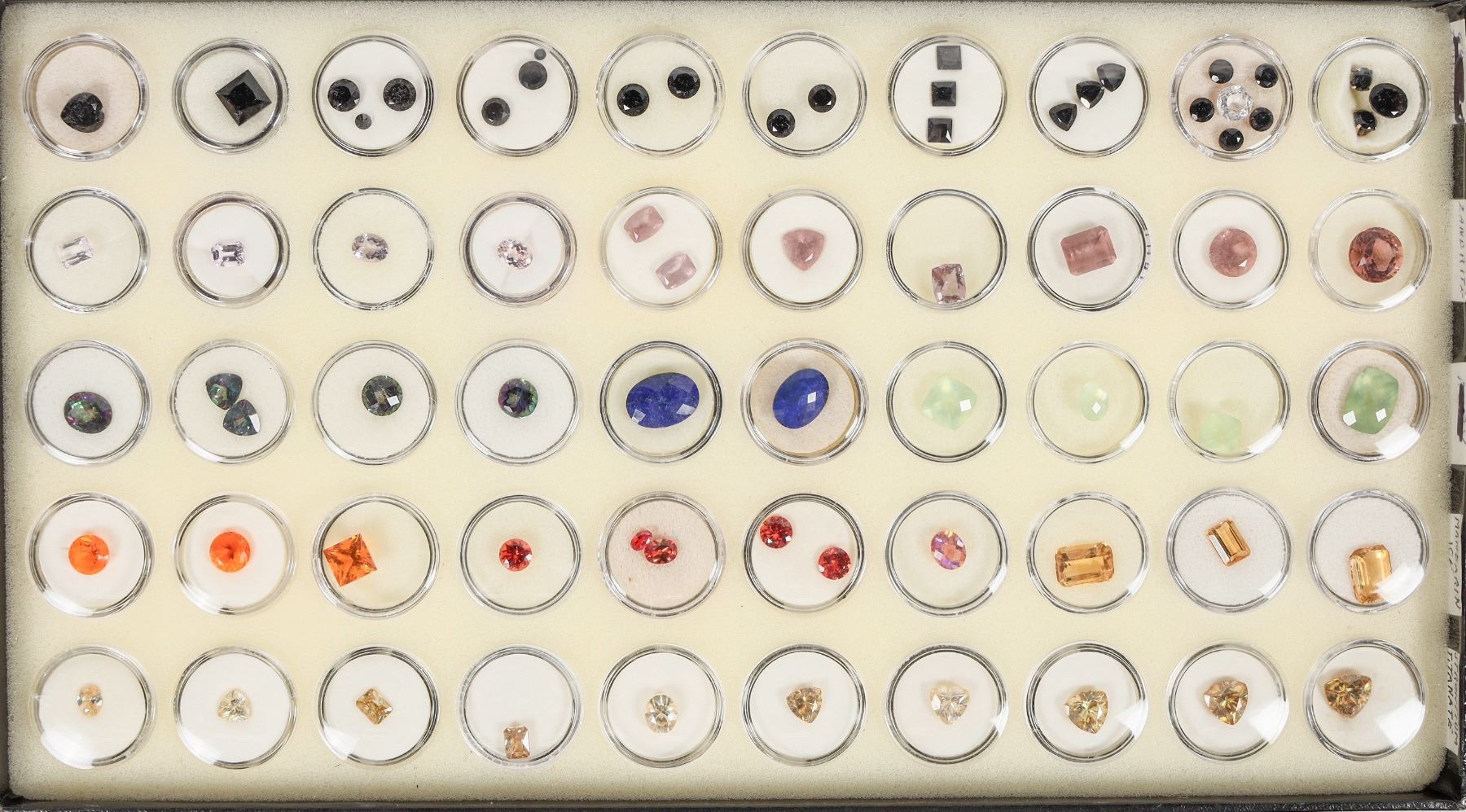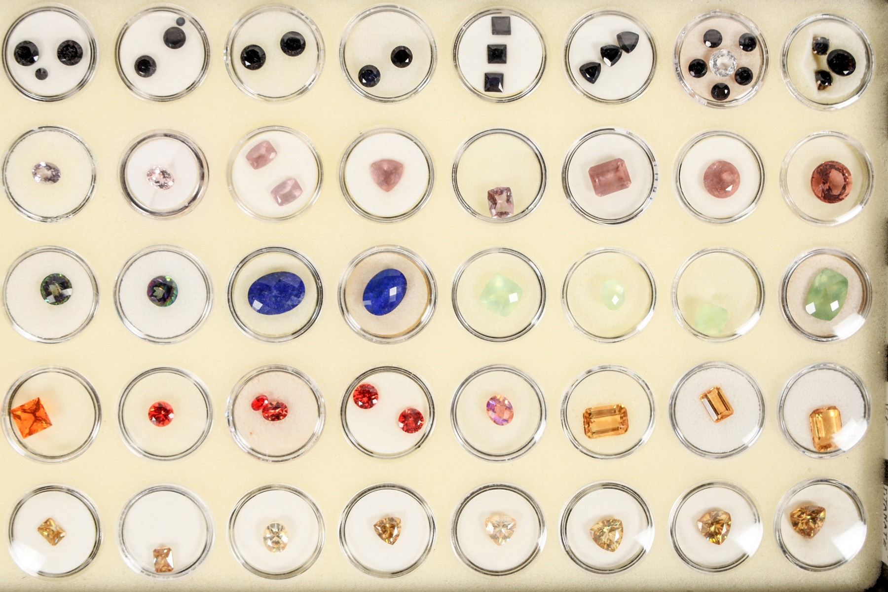 Faceted Gem Collection in 1" circular gem holders. 50 containers overall of 10 different faceted gems of varying sizes. About 71 pieces overall. Very colorful. Includes: lab sapphire, mandarine ice, titanite, lapis, kunzite, black spinel, zandrite, and prehnite. Please inspect, an excellent lot. About 1mm up to 1.5cm. Numerous different faceted shapes and hues.