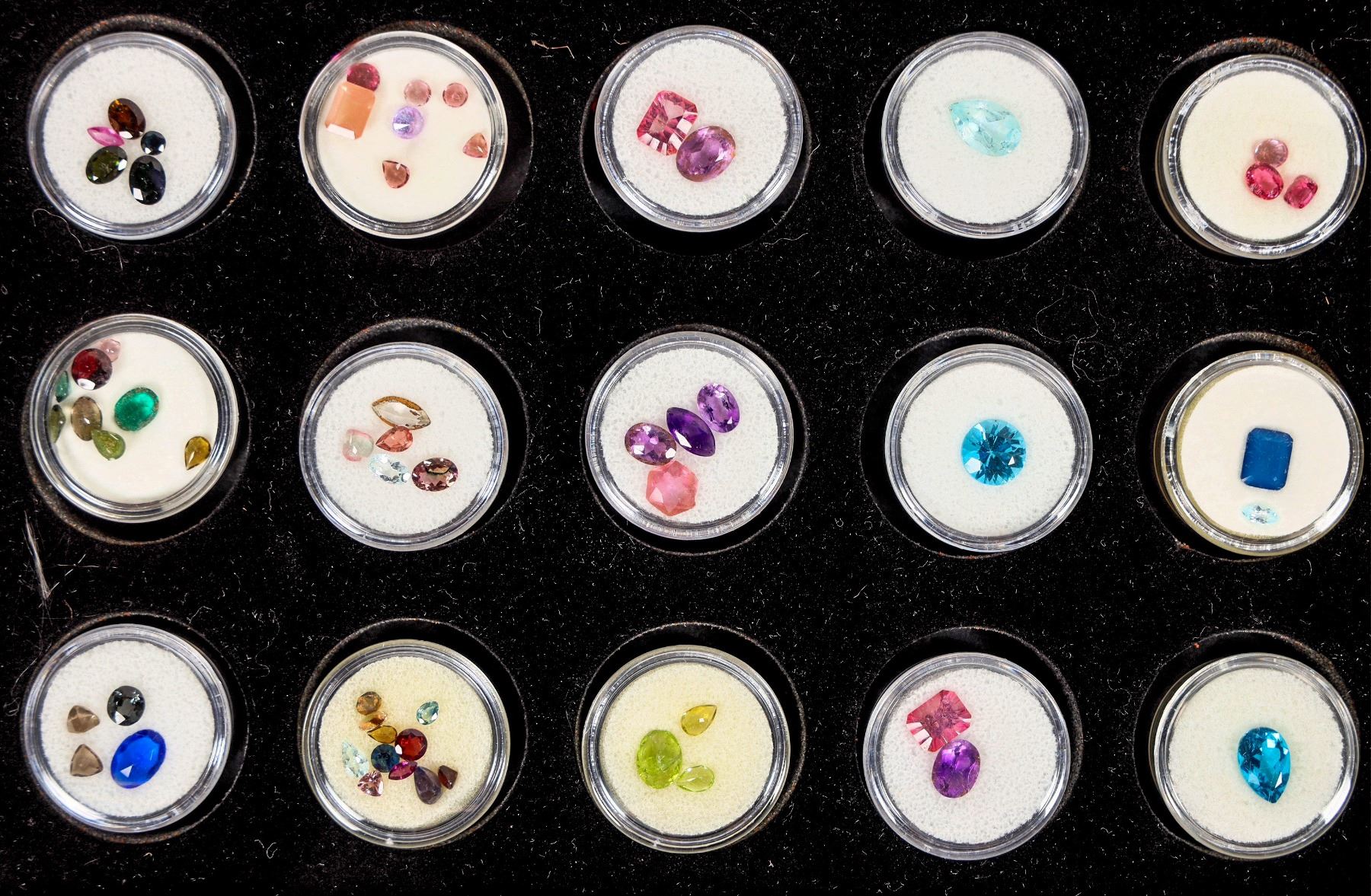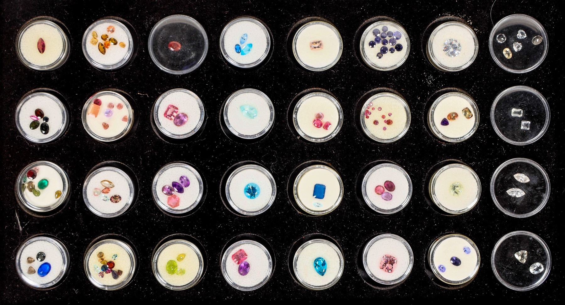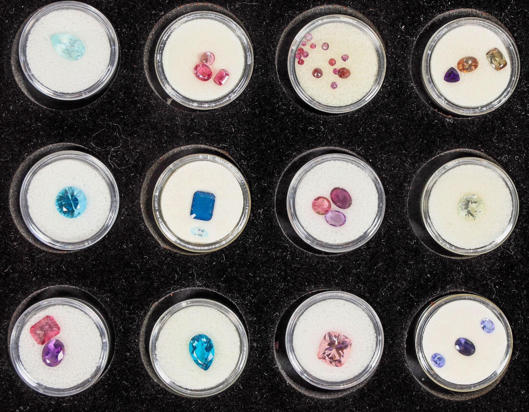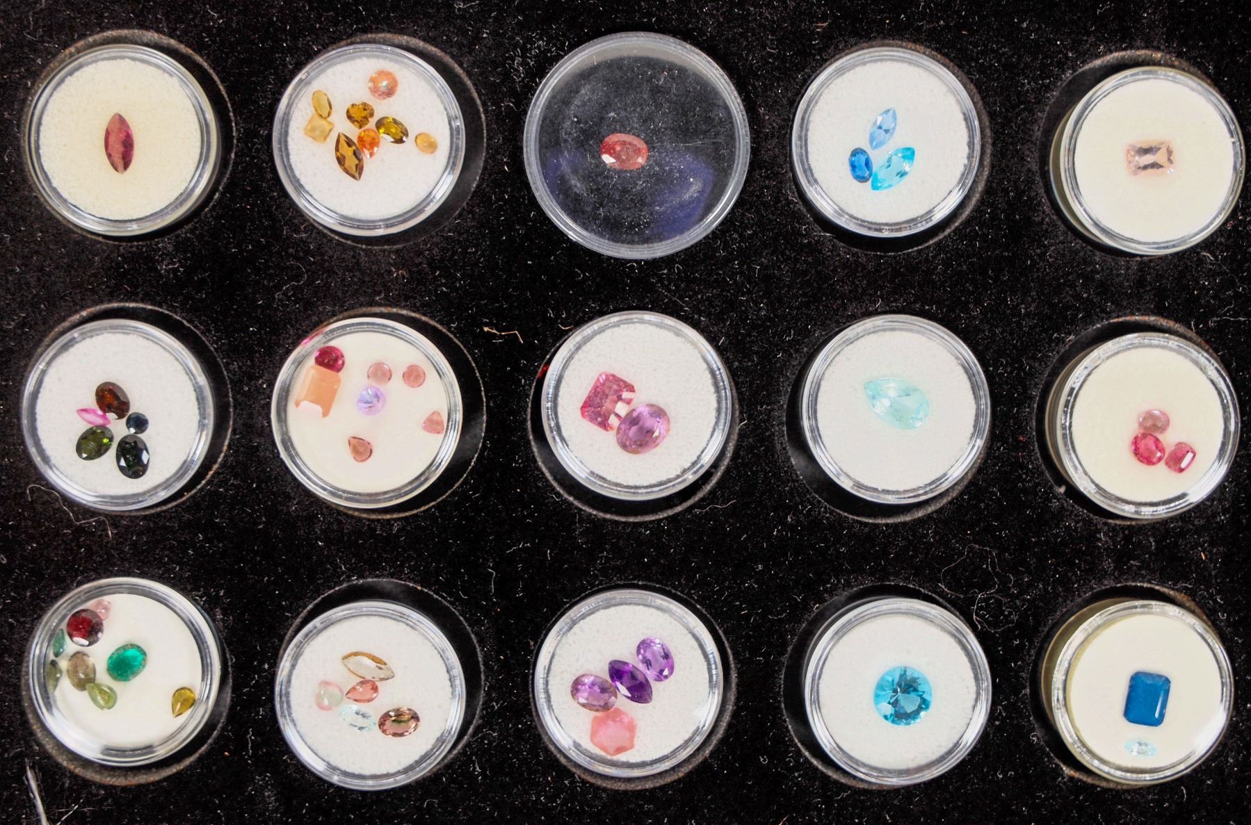 Faceted Stones Variety Collection. A very nice selection including artificial stones. in 1" circular gem holders. 32 containers overall. Over 100 or more stones overall. Very colorful. Strong on purples and blues. Includes: Paraiba calcedony, sapphire, iolite, tanzanite, cubic zirconia, etc. Please inspect, an excellent lot. About 1mm up to 1.5cm. Numerous different faceted shapes and hues.