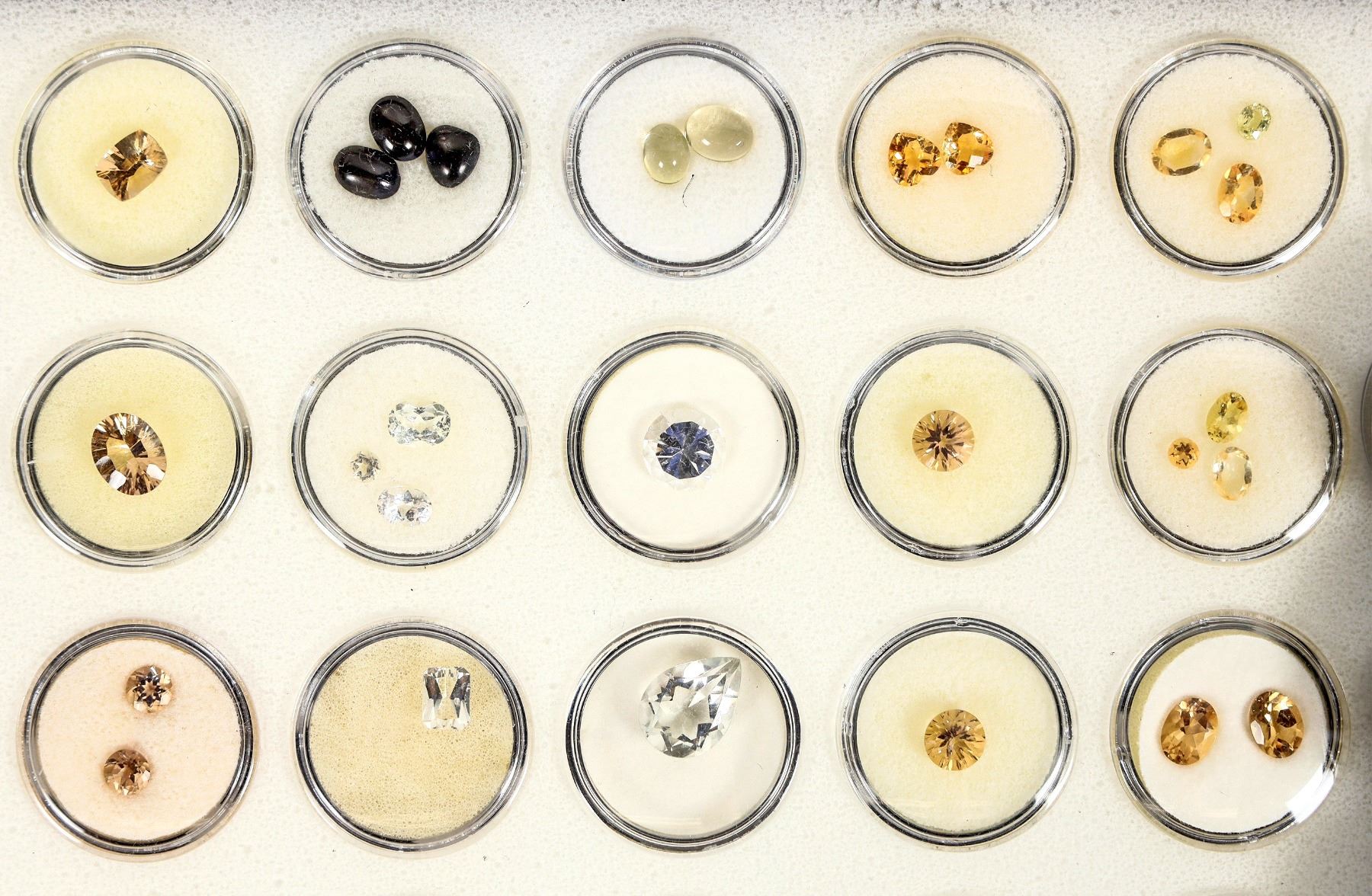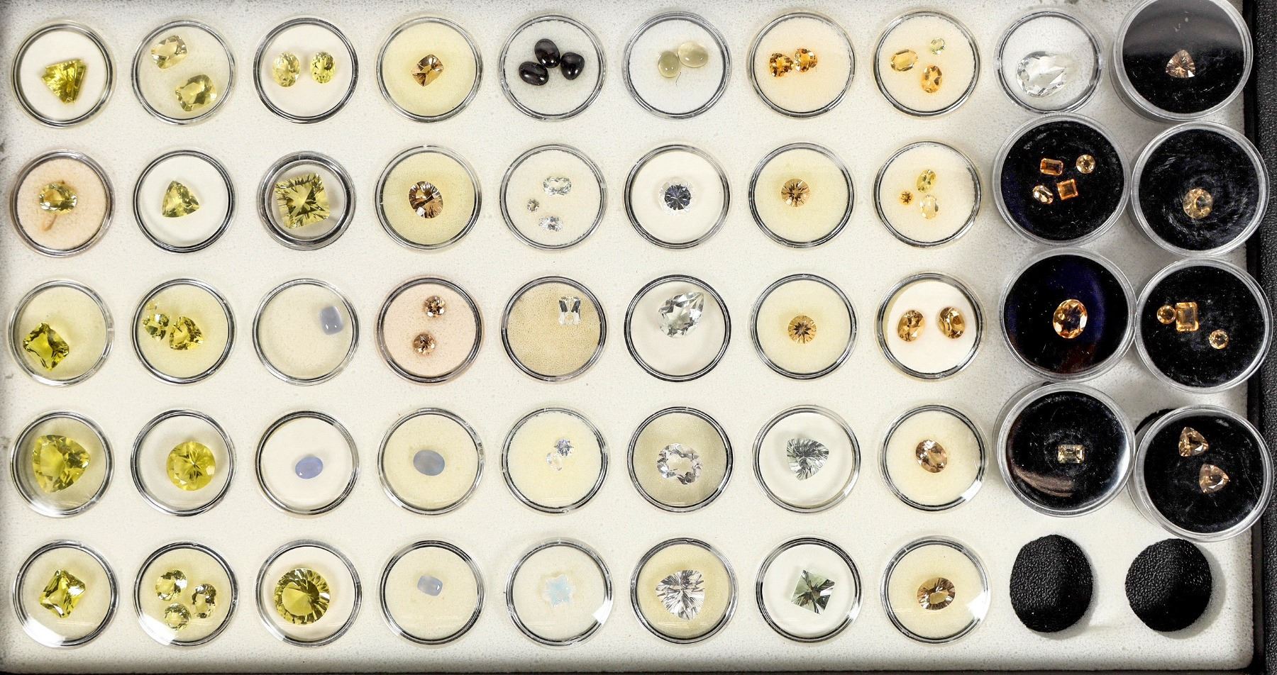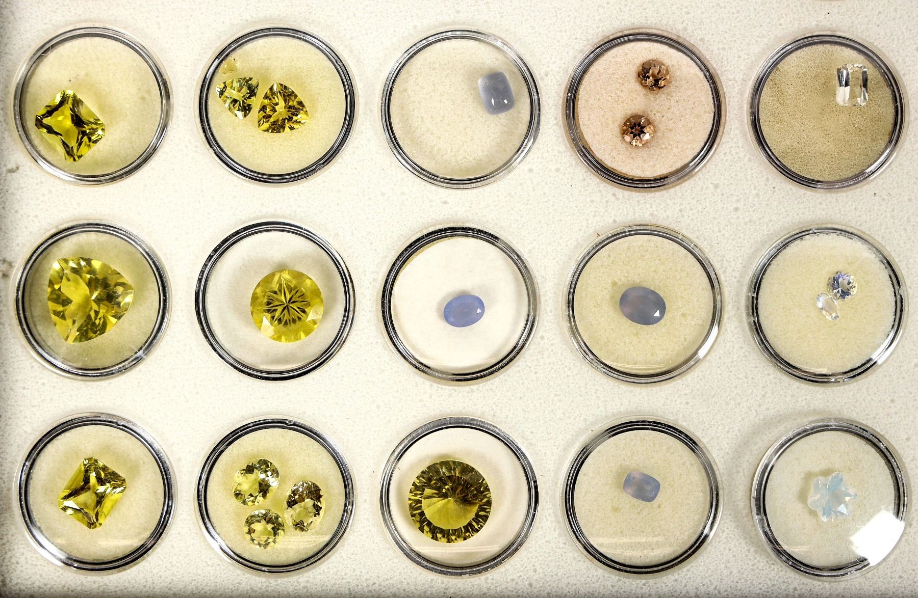 Faceted Quartz Varieties. 48 1" circular gem holders containing a variety of quartz gemstones. Varieties include lemon quartz, blue calcedony, champagne quartz, clear quartz, citrine quartz, blue moon quartz and possibly others. About 75 pieces overall. Sizes vary from about 4mm up to 2cm.