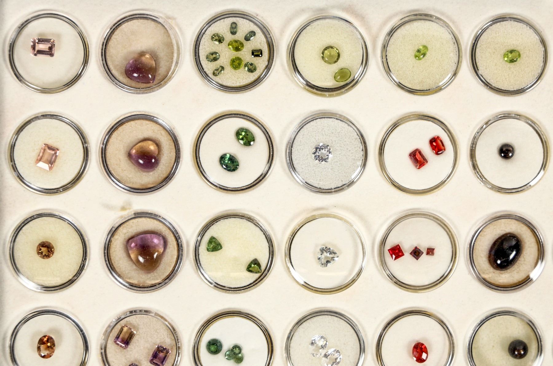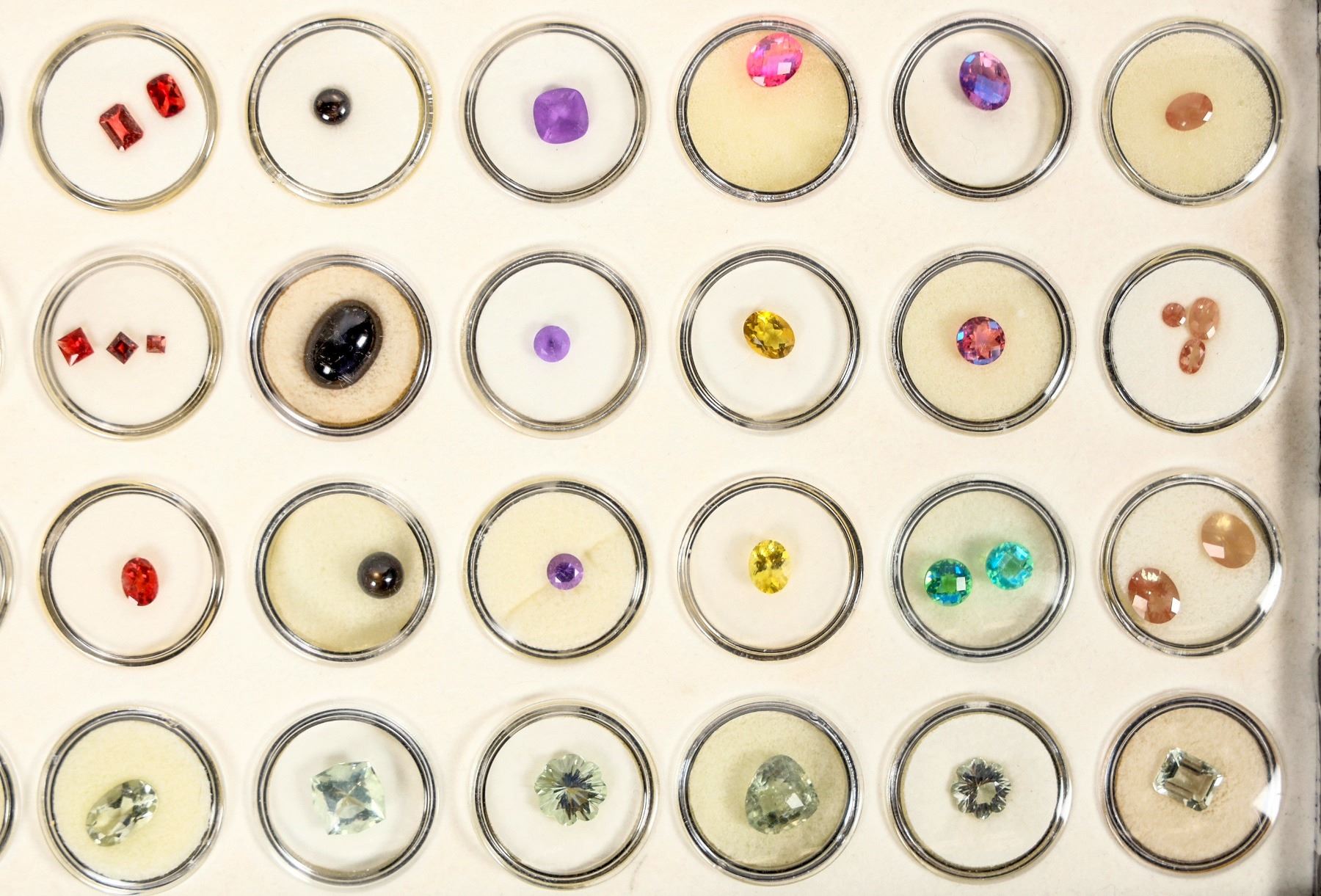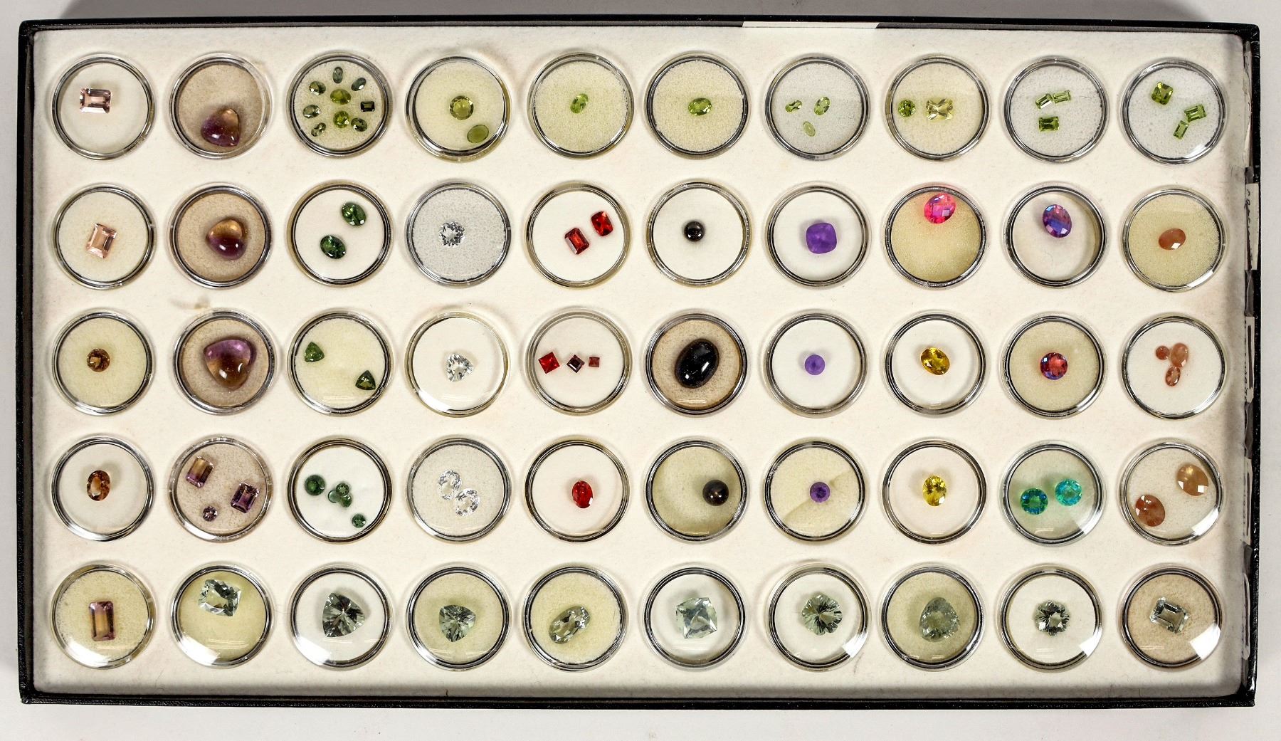 Faceted Stones Variety Collection. A very nice selection including artificial stones. in 1" circular gem holders. 50 containers overall. Over 100 or more stones overall. Very colorful. Includes: Russian Alexandrite (lab), Green Apatite, Andalusite, Kunzite, Labradorite, zandrite, Canary Apatite and more. Please inspect, an excellent lot. About 1mm up to 1.5cm. Numerous different faceted shapes and hues.