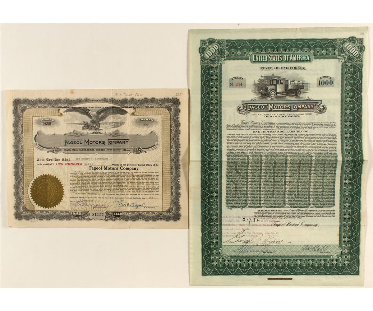 Stock certificate and Bond. Truck mfg. Prag Collection