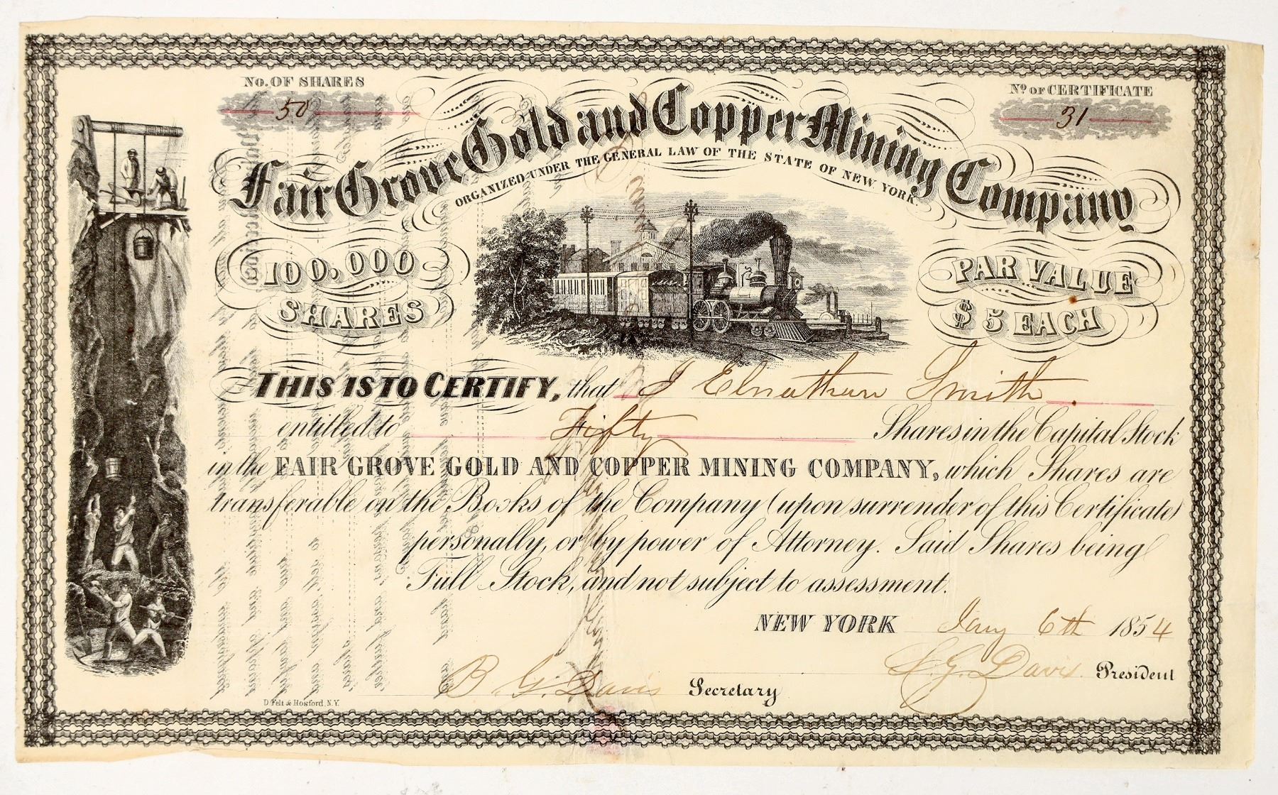 Very rare and early. Organized in New York. No. 31, issued for 50 shares to J. Smith in New York in 1854. Signed by president SJ Davis and secretary BG Davis. Not cancelled. Mining and locomotive vignettes. Deep folds and creases. 6 x 10" This company operated at Fair Grove (now Thomasville), Davidson County, North Carolina. The property, 46 acres, was leased by Nathan Kendall. (See:https://ils.unc.edu/nclibs/davidson/beftvl.htm) No other info located.