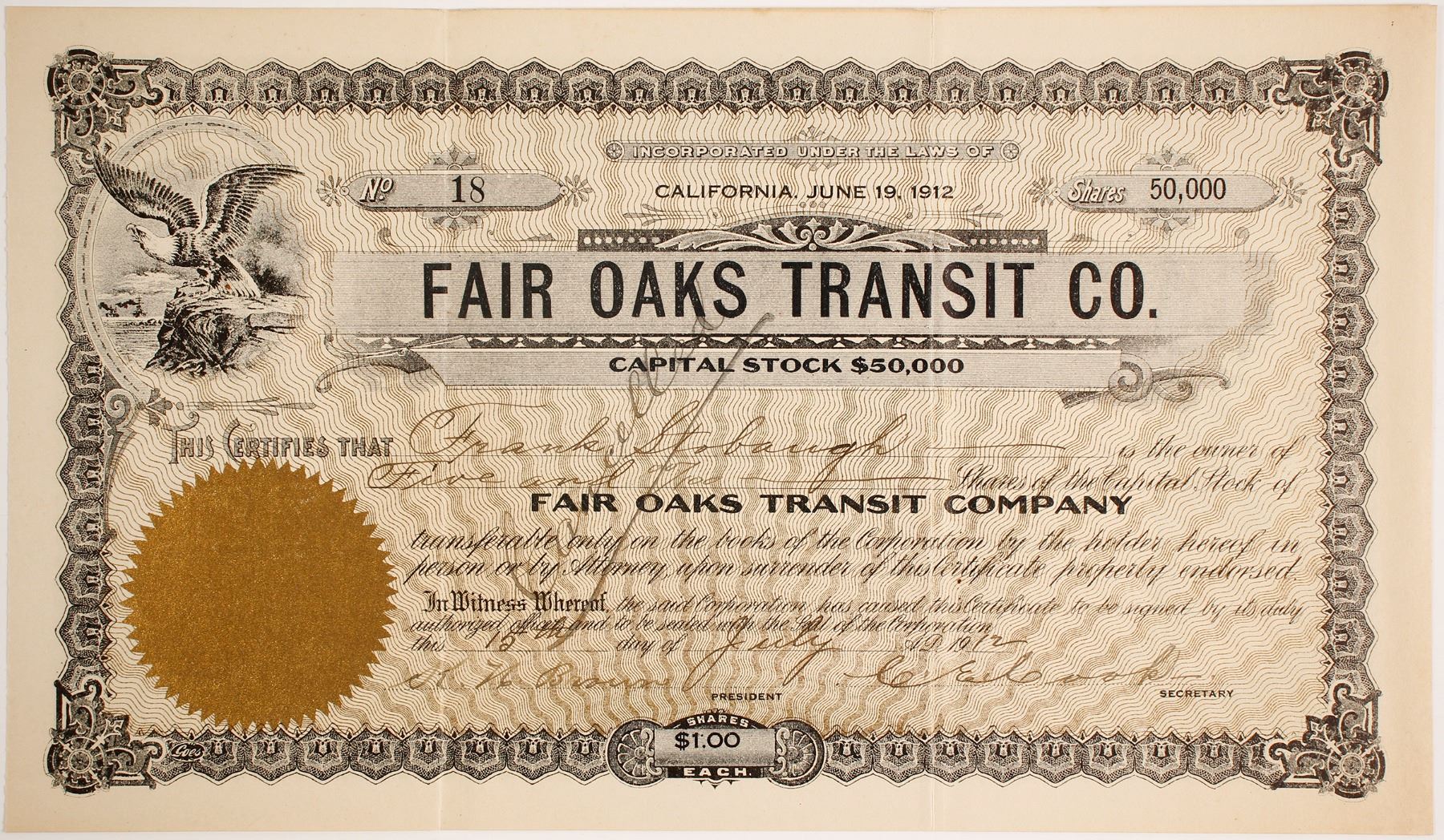 Cancelled 50,000 shares of Fair Oaks Transit Co Capital stock @ $1 each cert. #18 issued to Frank Stobaugh on July 15, 1912. Grey border, gold company seal. Vignette of eagle with wings spread on cliff overlooking body of water. Signed by K. N. Browne, pres. and C. E. Cook, secy. Inc. in CA on June 19, 1912. This company, like many others of this time period, started small and may have only lasted a few years and maybe in a limited number of states. No information on the company as to dates of operation, owners, even states in some cases, earlier name and if they consolidated with another company, went into bankruptcy or just closed. Printed: GOES. Prag collection. California Ken Prag Collection