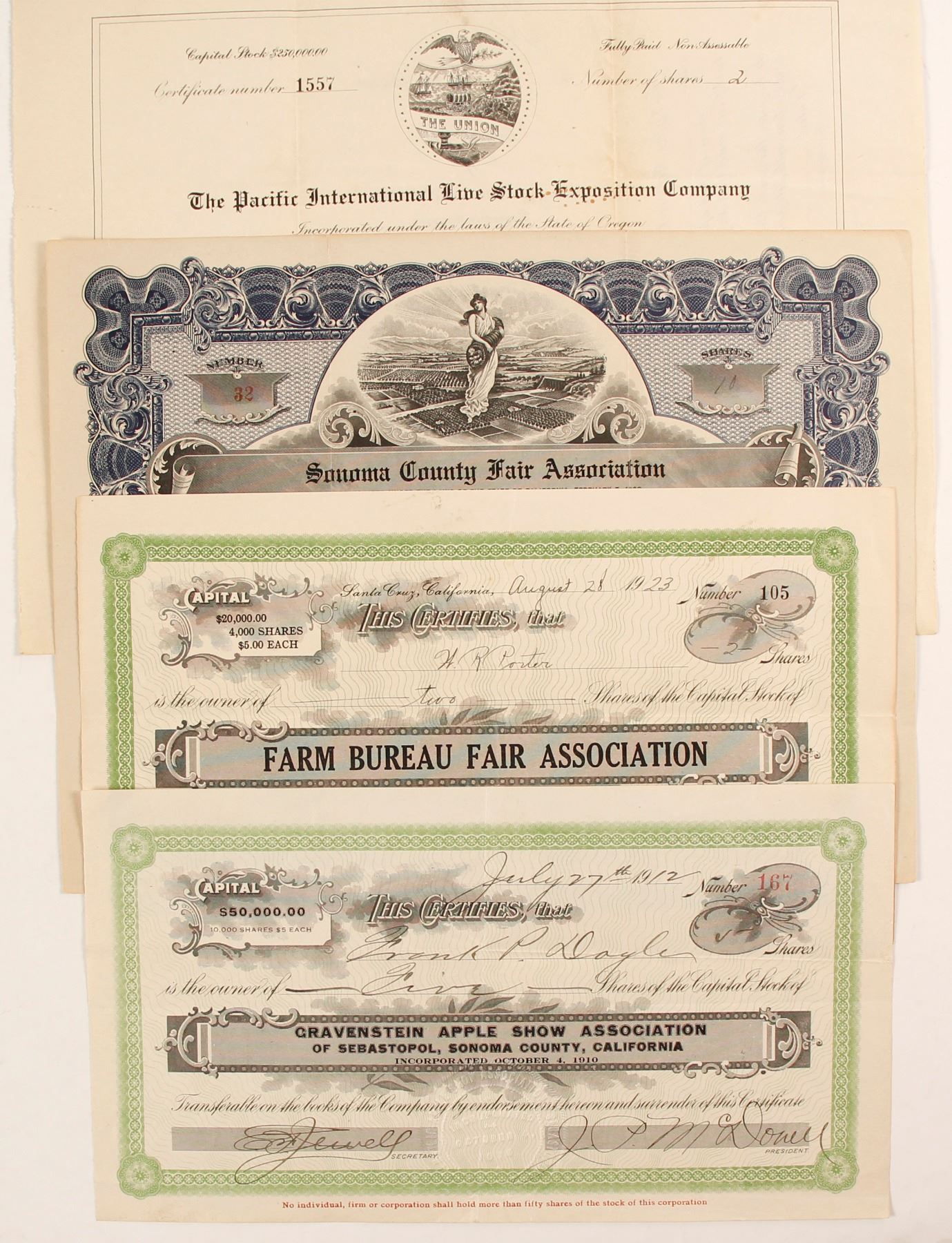 2. Farm Bureau Fair Assoc. Incorporated Santa Cruz State of Calif . Cert # 105 for 2 shares of common stock @ $5 per share issued to W.R. Porter August 28, 19223 Signed F.L. Selleck President, corp seal center bottom, no vignette, unknown printer, no tears stainsFine cond. iu