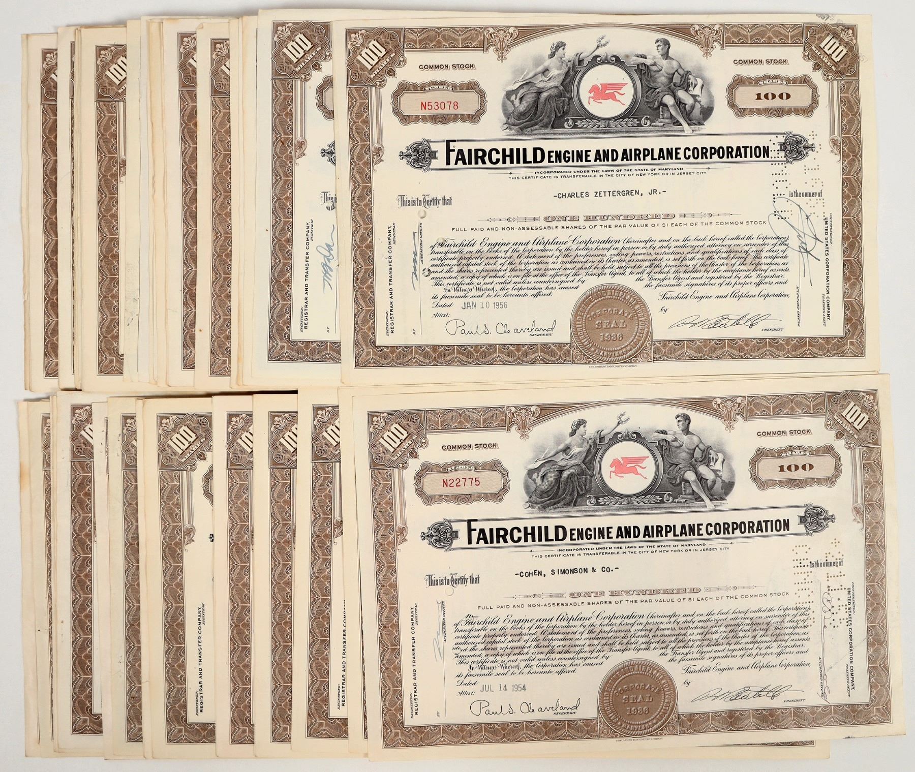 Approx. 50. I/C. Issued 1954-56. Fine or better. Fairchild Engine and Airplane Corp. Stocks. Cancellation is by punch. Columbian BNC printer.