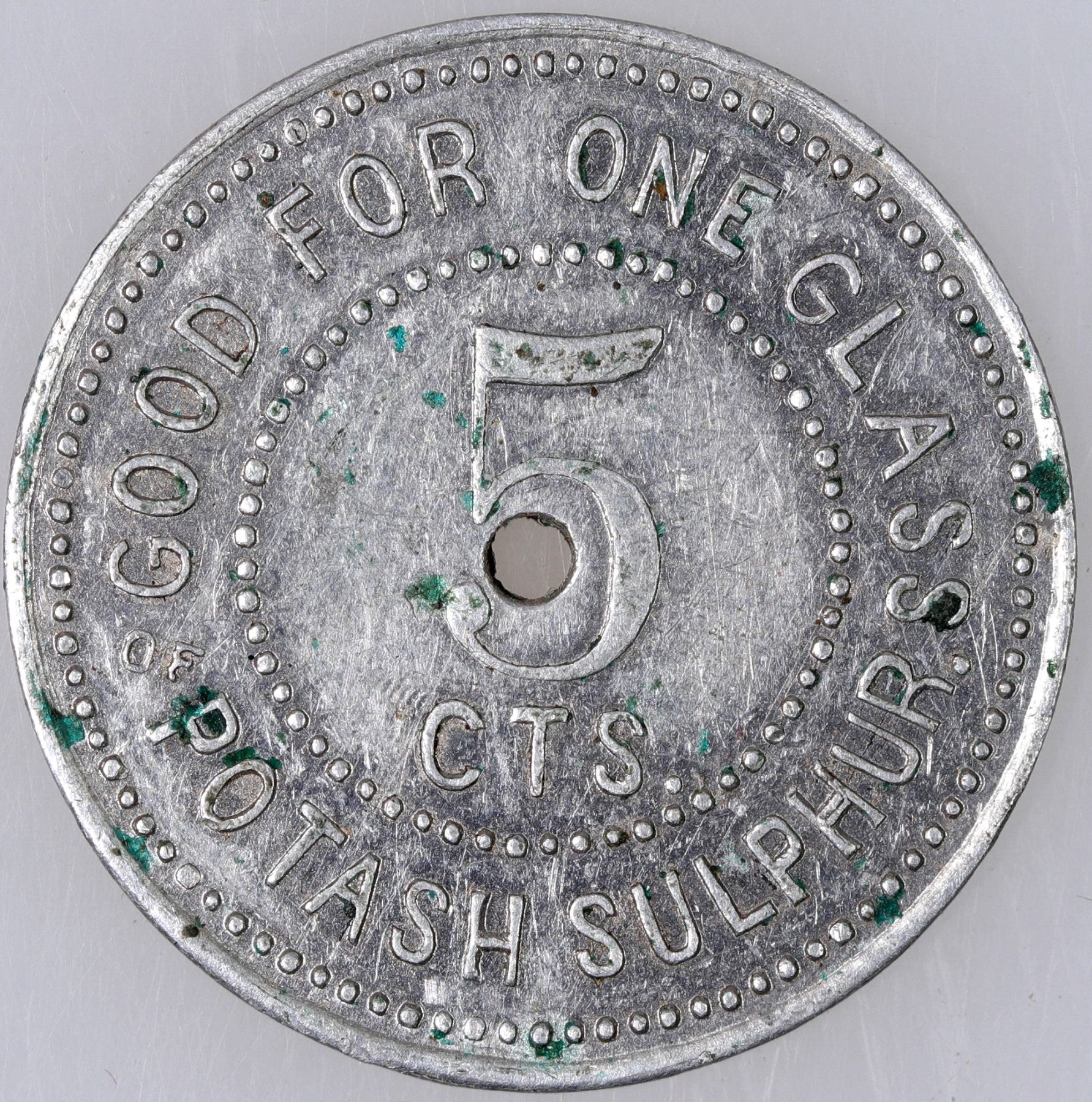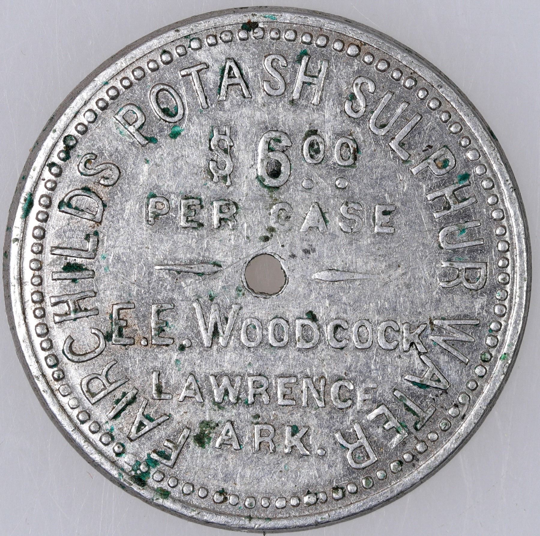 The only token listed from Lawrence Arkansas: FAIRCHILDS POTASH SULPHUR WATER / $6.00 / PER CASE / E.E. WOODCOCK / LAWRENCE / ARK. // GOOD FOR ONE GLASS / 5 / CTS. / OF POTASH SULPHUR.; Al., rd., 26 mm. _x000D_ [Lawrence] [Arkansas]