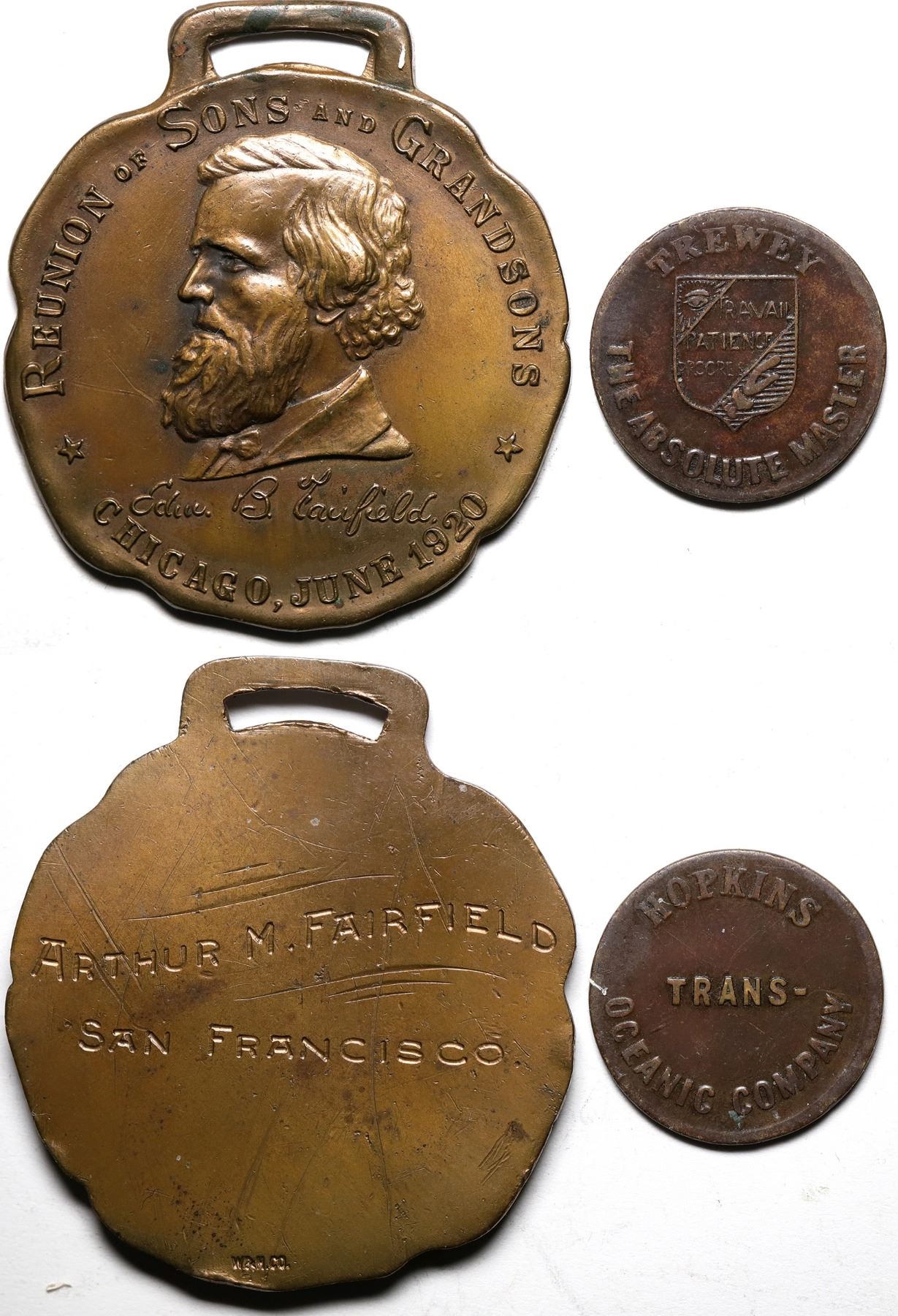 1) 1920 watch fob. Reunion of the Sons and Grandsons. Bust of Edwd B. Fairfield, Chicago, June 1820. Reverse engraved Arthur M. Fairfield, San Francisco. Arthur Fairfield is likely the California Deputy Fish Commissioner. Small W&H Co. (Whitehead & Hoag) mark at 6 o’clock on the reverse. 42mm, Brass. AU