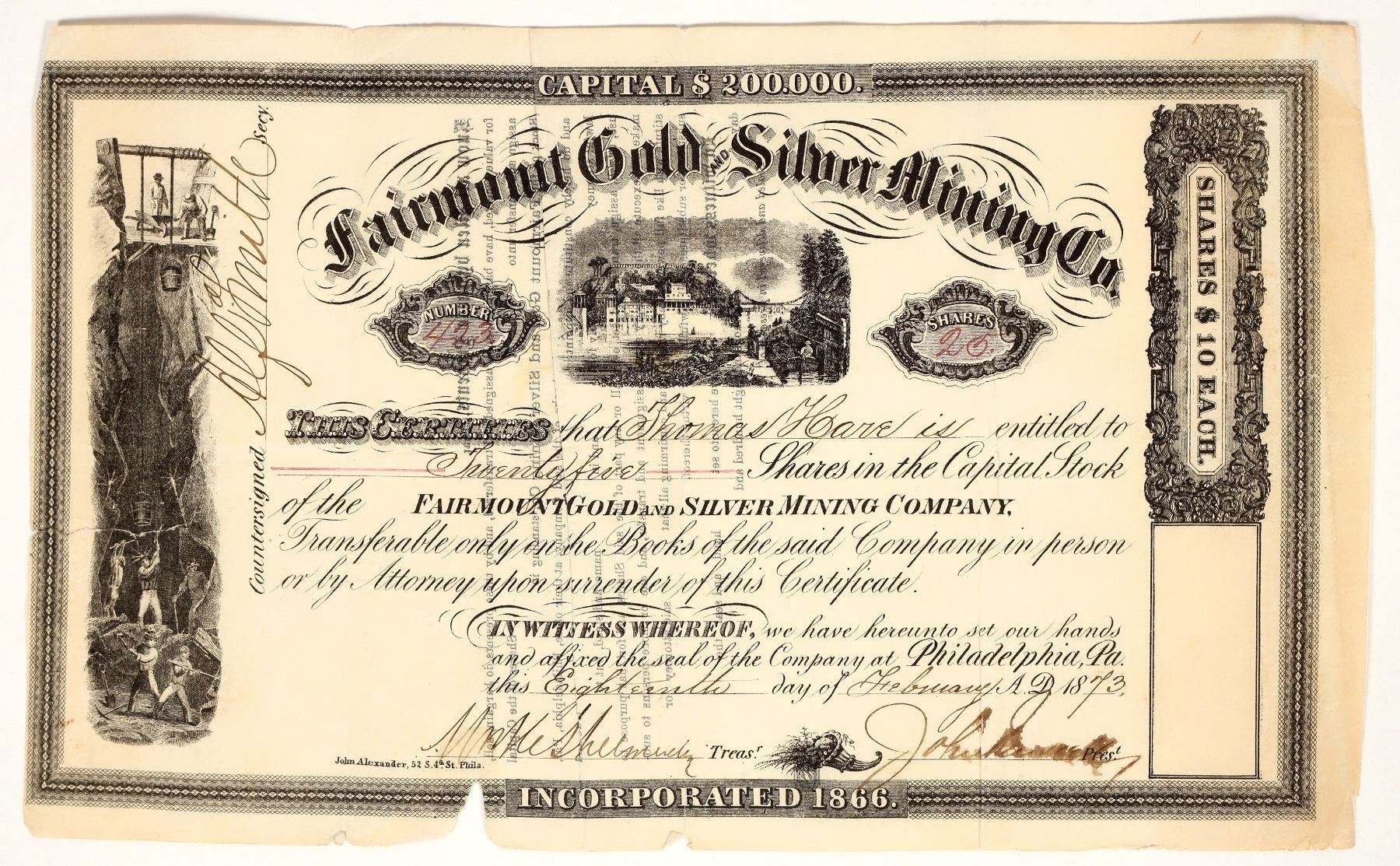 Inc. 1866. No. 423, issued in 1873 to Thomas Hare for 25 shares. Signed by the president (illegible) and treasurer. Not cancelled. Black border and print, mine hoisting vignette at left, agricultural scene at top center. 6.5 x 10.25" Rough edges, tears. See photo. Owned 12 claims at the head of Virginia Canyon at Idaho Springs, Clear Creek County, Colorado. Not listed in C&L.
