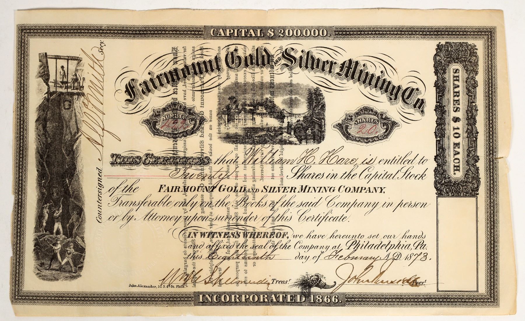 Inc. 1866. No. 122, issued in 1873 to William Hare for 20 shares. Signed by the president (illegible) and treasurer. Not cancelled. Black border and print, mine hoisting vignette at left, agricultural scene at top center. 6.5 x 10.25" Rough left edge, tear on right border. Owned 12 claims at the head of Virginia Canyon at Idaho Springs, Clear Creek County, Colorado. Not listed in C&L.