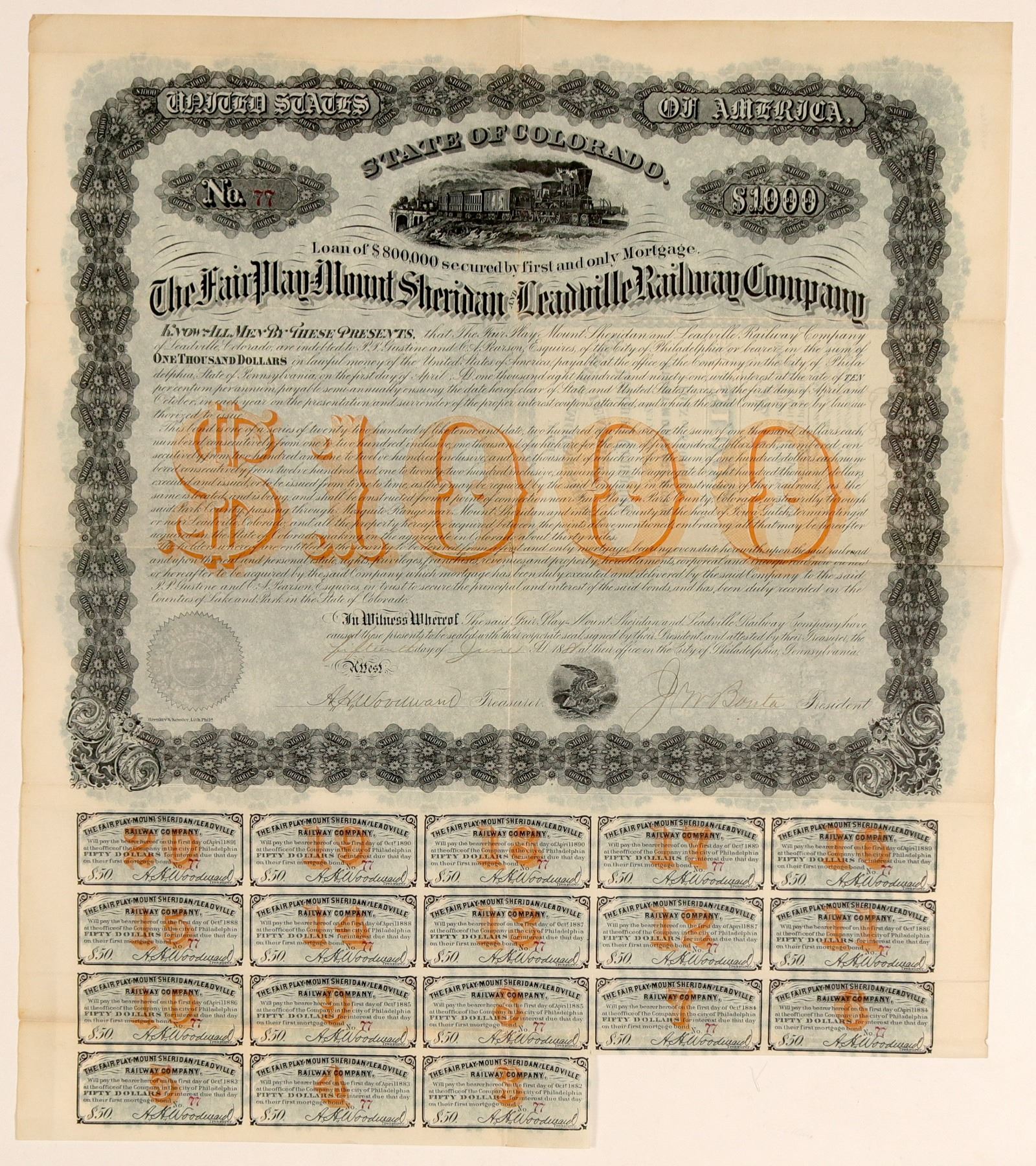 Bond from the Fairplay, Mount Sheridan and Leadville Railway Co. Incorporated in 1881 in the State of Colorado. Certificate number 77. Issued in 1881 at Philadelphia. Signed by J Banta, and A. H Woodward. Printed by Breuker & Kessler, Lith. Phila. Size 15.75 by 18.25 inches. In nice condition with no major issues. Not cancelled. Nice vignette of train, with smoke n fire... rolling... Plus an eagle standing on a shield with stars, between names of the Treasurer & President. 1000 Mortgage bond. According to The Railway Age Monthly and Railway Service Magazine, Volume 2, 1881, this company proposed to build a railroad from Leadville to Fairplay to connect with the Union Pacific. Their proposed route included a tunnel through Horse Shoe Pass. The new route from Denver to Fairplay would be 115 miles, a savings of 57 miles from the current route.