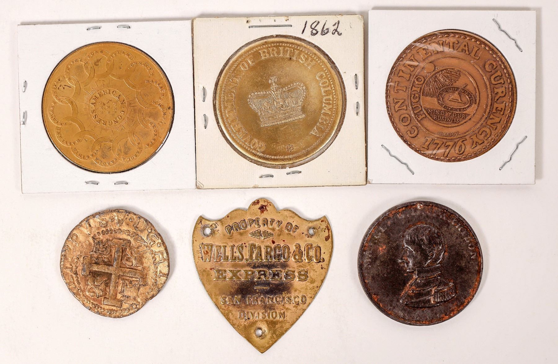6 fakes. Wells Fargo & Co. Express, Harrison, 2x Continental Currency, BC $20, ancient coin. Makes a good display set.