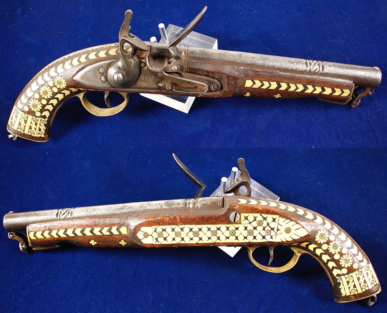 A beautiful Ivory style trade gun, replicating the East Indies Trade Company. This is a beautiful rendition of an 18th century large caliber single shot handgun used shipboard typically. NON FIRING RELICA meant for office or den display. Excellent construction, most likely made in Spain. Date: Location: HWAC# 56229