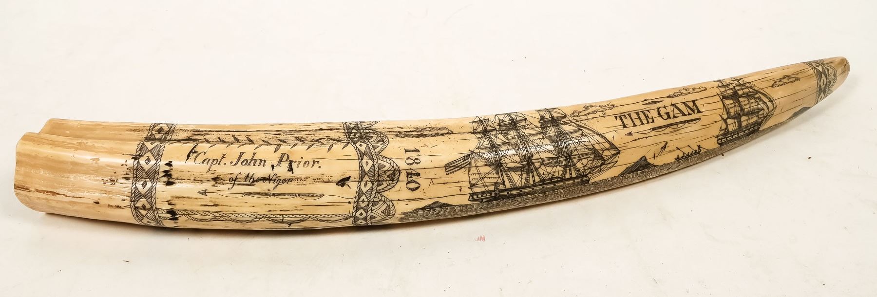 This is a reproduction of walrus tusk at 24 inches depicting "the Gam". The gam is a nautical term that describes two whaling vessels exchanging men and stories while at sea. The is no evidence to support that either the Niger or the Sea Fox were ever whaling vessels, however it makes for a beautiful reproduction that can be legally owned. Made by Juratone #64 of London c.1970's.