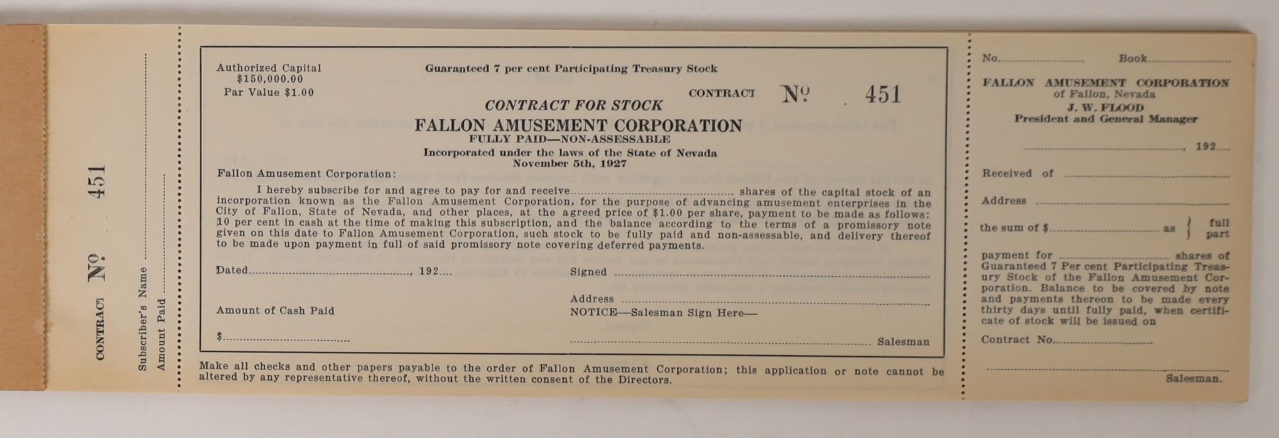 Book #19 of stock certificates #451-475, unissued Guaranteed 7 per cent Participating Treasury Stock in the Fallon Amusement Corporation, incorporated November 5th, 1927.For the purpose of advancing amusement enterprises in the City of Fallon, State of Nevada, and other places. Nevada Fallon 1927