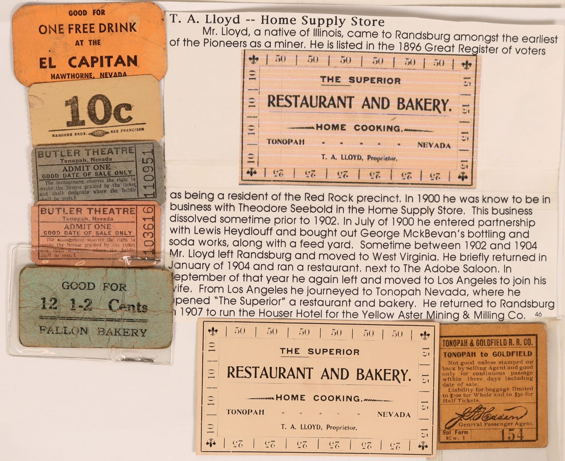 Seven pieces: Meal ticket from The Superior Restaurant And Bakery, Tonopah; Good For 12 1/2 Cents, Fallon Bakery; Butler Theatre, Tonopah (3); Good For A Free Drink at the El Capitan, Hawthorne; Tonopah & Goldfield R.R. Co. ticket. Ex: Ron Lerch Collection.
