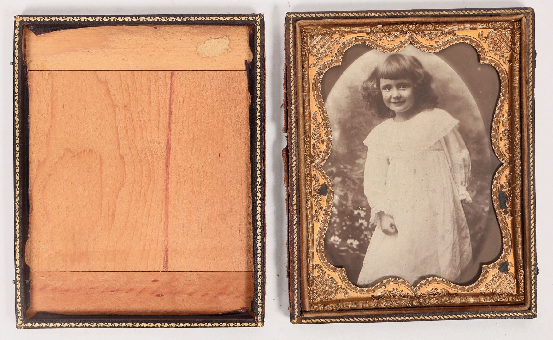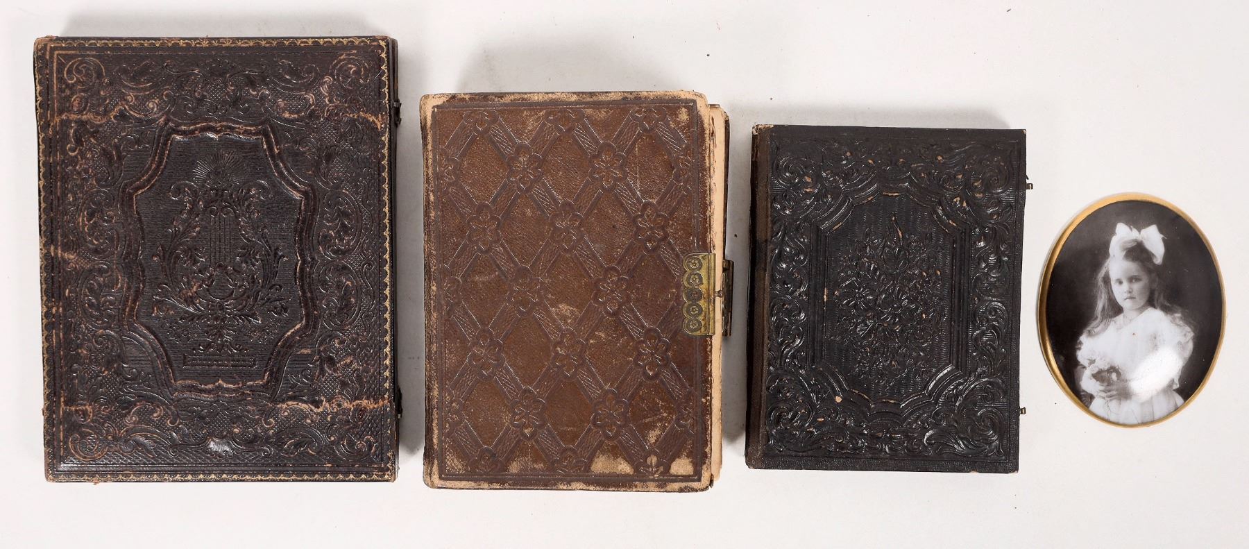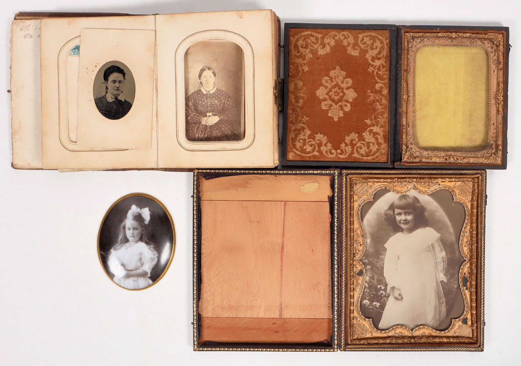 A collection of early photographs, mostly from Kentucky, and 2 cases, c1850s-60s. The lot includes an approximate 4" x 5" x 1.5" leather family photo album with 17 paper photos inside. Visible surnames include: Wilford, Carless and Wilson. Photographers include: E.L. Faulks, Photographer & Ambrotypist, Hopkinsville, Ky.; J.E. Griffin, Capiz, Ky.; K. McKinnon, Paducah, Ky.; Clarence Anderson, Hopkinsville, Ky. Personal inscription inside. Also included are a photograph of a little girl with bow on 2.5" x 3" porcelain oval with gold painted edging, A.G Reinhardt Studio, St. Louis, Mo. insignia on back; and 2 wooden, leather covered cases - 3.5" x 4.5" 1/3 plate empty case with loose hinge, and 4.75" x 6" case with newer paper photo of young girl inside, hinges missing.