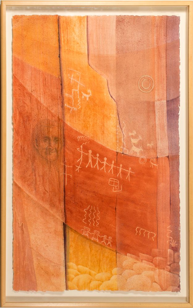 Watercolor by Ruth Hilts (Framed: 40" H x 27" W), petroglyphs in Valley of Fire State Park, Clark County, Nevada part of the Nevada Earth Colors Series. Painting has raised overlay of face above petroglyph images. Pigments used in this painting were hand-ground by the artist from Nevada soils and minerals.