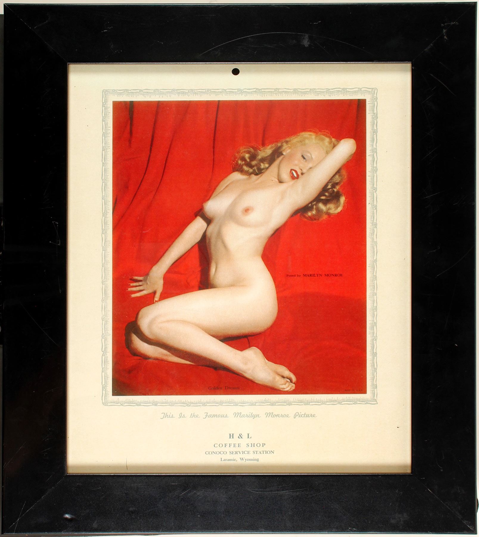Well if you are the kind of man, who likes " Nice Things" ,and after a hard day at work want something nice to welcome you home....HERE IT IS !! The most famous picture of Marilyn Monroe, entitled " Golden Dreams". 17 1/2" tall, x 14 1/2" wide, framed and ready to go. The back has a nice story , and tells how she ended up in this photo. It has a glass cover , but needs to be replace because it is damaged . But she is worth it don't you agree ? This item hung for many years in the H & L Coffee Shop, in the Conoco Service Station, in Laramie, Wyoming. Finally someone rescued this fair maiden, and took her to a place of importance !! Now...she can be yours. Go for it... ( RH ). State: Wyoming City: Laramie Date:
