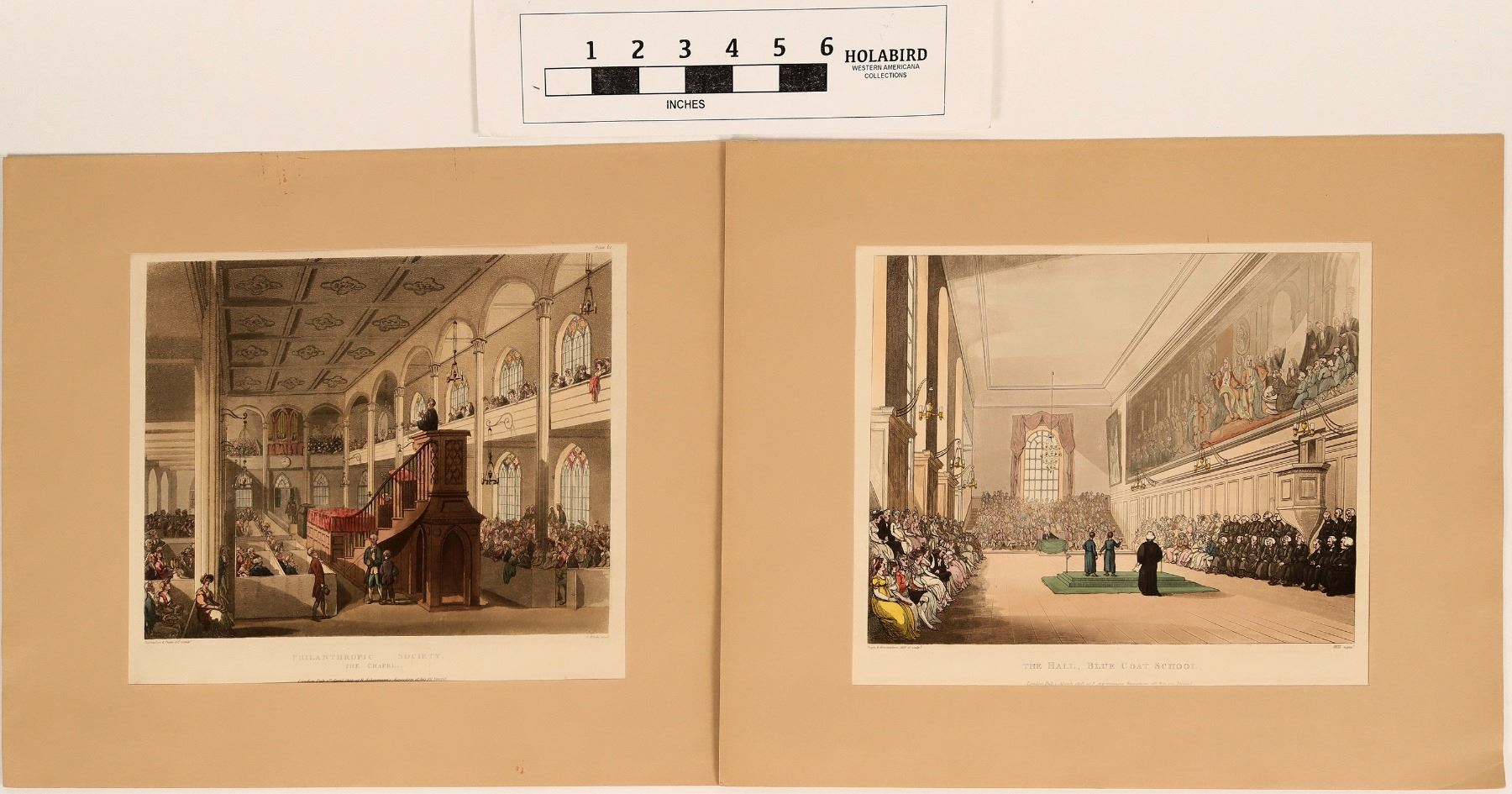 Two original colored lithographs published in 1800 by F. Ackerman's Repository of Arts. One depicts the Philanthropic Society, The Chapel. The other shows The Hall, Blue Coat School. Both images are 10-1/4 x 7-13/16 inches and mounted in heavy paper mattes at 16-1/2 x 13 inches. Suitable for framing as is. Images are undamaged.