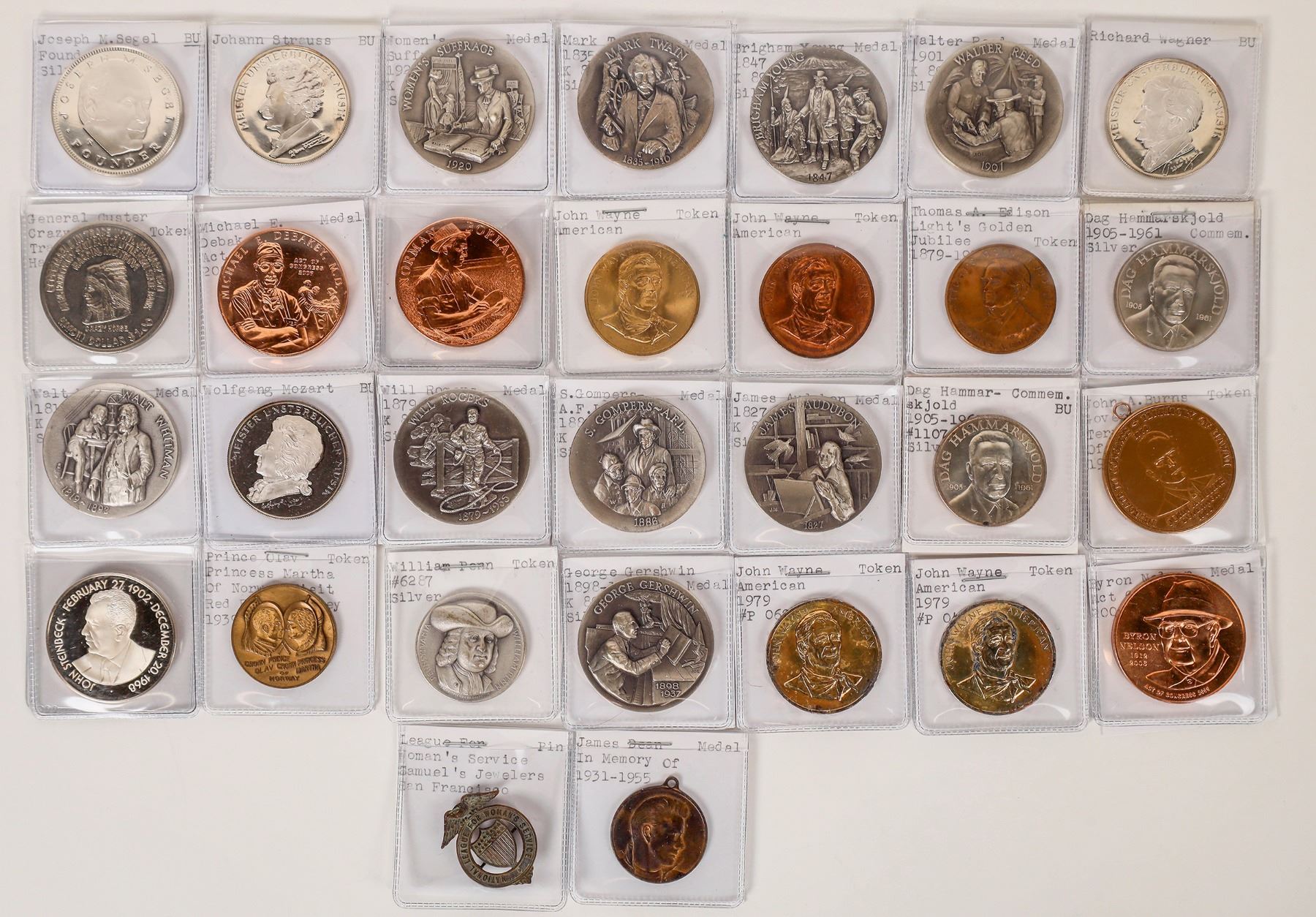 Lot of 17 silver and 11 other medals commemorating famous people. Silver: Mark Twain, George Gershwin; Walter Reed; Samuel Gompers; Walt Whitman; Mozart, Strauss, Wagner; Brigham Young; Will Rogers and others. (Most are Longines Symphonette .925 silver). Other medals: James Dean, John Wayne, Thomas Edison, General Custer, Michael Debakey, Byron Nelson and others.