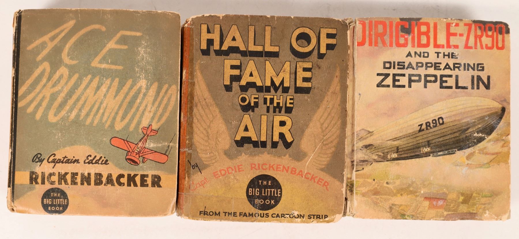 3 Big Little Books related to famous early aviation. Dirigible-ZR90 and the Disappearing Zeppelin, Hall of Fame of the Air, Ace Drummond by Rickenbacker. Fair to good condition.