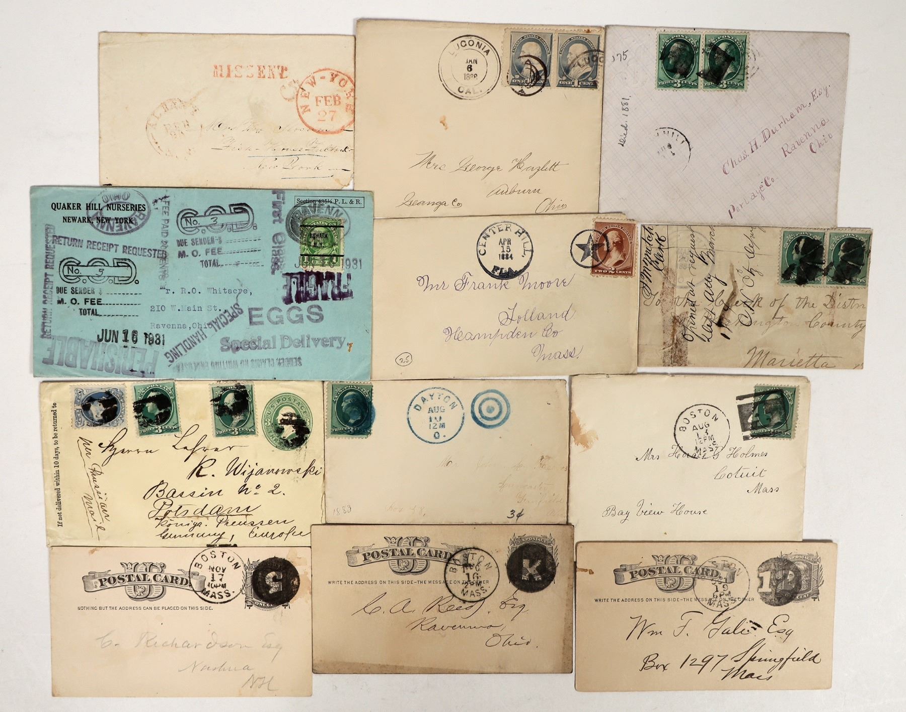 Lot of 12. Mixture of covers and postcards. I.E.; 1873 almost perfectly centered (rare) 3c green stamps w/rare "L" cancellation. Laconia, Cal. 1888 postmark x2 and circle cancel. New York postmark and stamped "MISSENT" and more.